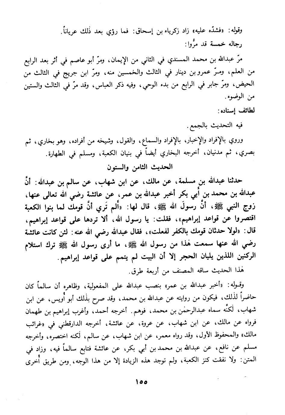حَدَّثَنَا عَبْدُ اللَّهِ بْنُ مَسْلَمَةَ، عَنْ مَالِكٍ، عَنِ ابْنِ شِهَابٍ، عَنْ سَالِمِ بْنِ عَبْدِ اللَّهِ: أَنَّ عَبْدَ اللَّهِ بْنَ مُحَمَّدِ بْنِ أَبِي بَكْرٍ أَخْبَرَ عَبْدَ اللَّهِ بْنَ عُمَرَ، عَنْ عَائِشَةَ رضي الله عنها، زَوْجِ النَّبِيِّ -صلى الله عليه وسلم- أَنَّ رَسُولَ اللَّهِ -صلى الله عليه وسلم- قَالَ لَهَا: "أَلَمْ تَرَىْ أَنَّ قَوْمَكِ لَمَّا بَنَوُا الْكَعْبَةَ اقْتَصَرُوا عَنْ قَوَاعِدِ إِبْرَاهِيمَ". فَقُلْتُ: يَا رَسُولَ اللَّهِ أَلاَ تَرُدُّهَا عَلَى قَوَاعِدِ إِبْرَاهِيمَ. قَالَ: "لَوْلاَ حِدْثَانُ قَوْمِكِ بِالْكُفْرِ لَفَعَلْتُ". فَقَالَ عَبْدُ اللَّهِ رضي الله عنه: لَئِنْ كَانَتْ عَائِشَةُ رضي الله عنها سَمِعَتْ هَذَا مِنْ رَسُولِ اللَّهِ -صلى الله عليه وسلم- مَا أُرَى رَسُولَ اللَّهِ -صلى الله عليه وسلم- تَرَكَ اسْتِلاَمَ الرُّكْنَيْنِ اللَّذَيْنِ يَلِيَانِ الْحِجْرَ، إِلاَّ أَنَّ الْبَيْتَ لَمْ يُتَمَّمْ عَلَى قَوَاعِدِ إِبْرَاهِيمَ.