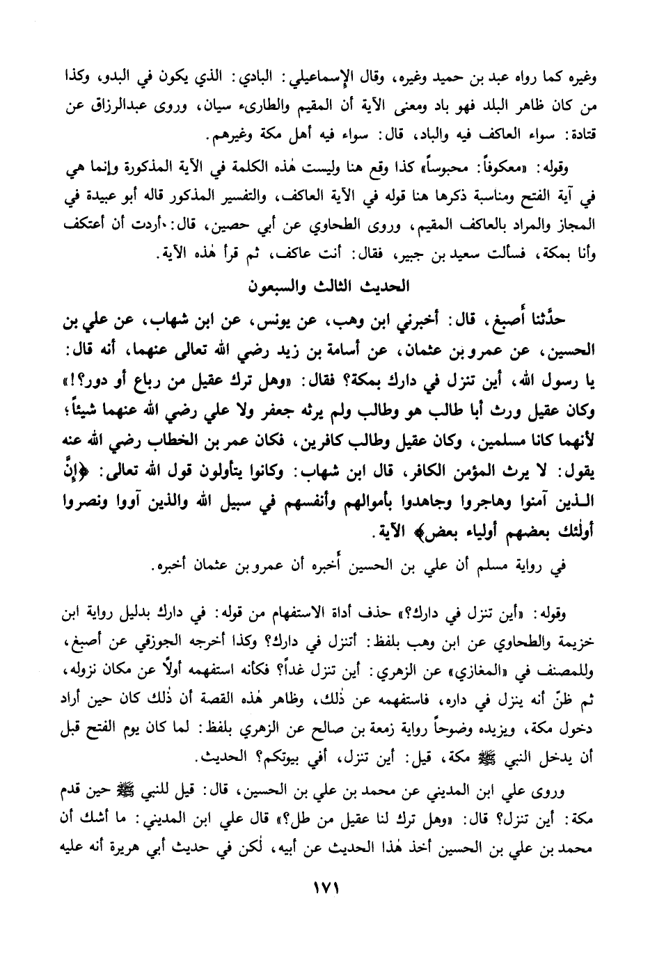 وروى علي ابن المديني عن محمد بن علي بن الحسين، قال: قيل للنبي -صلى الله عليه وسلم- حين قدم مكة: أين تنزل؟ قال: "وهل ترك لنا عقيل من طل؟ " قال علي ابن المديني: ما أشك أن محمد بن علي بن الحسين أخذ هذا الحديث عن أبيه، لكن في حديث أبي هريرة أنه عليه