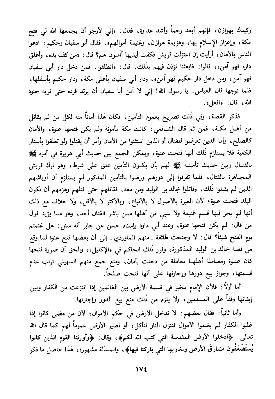 فذكر القصة، وفي ذلك تصريح بعموم التأمين، فكان هذا أمانًا منه لكل من لم يقاتل من أهل مكة، فمن ثم قال الشافعي: كانت مكة مأمونة ولم يكن فتحها عنوة، والأمان كالصلح، وأما الذين تعرضوا للقتال أو الذين استثنوا من الأمان وأمر أن يقتلوا ولو تعلقوا بأستار الكعبة فلا يستلزم ذلك أنها فتحت عنوة، ويمكن الجمع بين حديث أبي هريرة في أمره -صلى الله عليه وسلم- بالقتال وبين حديث تأمينه -صلى الله عليه وسلم- لهم بأن يكون التأمين علق على شرط، وهو ترك قريش المجاهرة بالقتال، فلما تفرقوا إلى دورهم ورضوا بالتأمين المذكور لم يستلزم أن أوباشهم الذين لم يقبلوا ذلك، وقاتلوا خالد بن الوليد ومن معه، فقاتلهم حتى قتلهم وهزمهم أن تكون البلد فتحت عنوة؛ لأن العبرة بالأصول لا بالأتباع، وبالأكثر لا بالأقل، ولا خلاف مع ذلك أنها لم يجر فيها قسم غنيمة ولا سبي من أهلها ممن باشر القتال أحد، وهو مما يؤيد قول من قال: لم يكن فتحها عنوة، وعند أبي داود بإسناد حسن عن جابر أنه سئل: هل غنمتم يوم الفتح شيئًا؟ قال: لا وجنحت طائفة -منهم الماوردي- إلى أن بعضها فتح عنوة لما وقع من قصة خالد بن الوليد المذكورة، وقرر ذلك الحاكم في "الإكليل"، والحق أن صورة فتحها كان عنوة ومعاملة أهلها معاملة من دخلت بأمان، ومنع جمع منهم السهيلي ترتب عدم قسمتها، وجواز بيع دورها وإجارتها على أنها فتحت صلحًا.