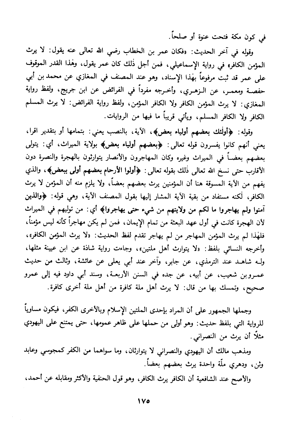 وقوله: {أُولَئِكَ بَعْضُهُمْ أَوْلِيَاءُ بَعْضٍ} الآية، بالنصب يعني: بتمامها أو بتقدير اقرا، يعني أنهم كانوا يفسرون قوله تعالى: {بَعْضُهُمْ أَوْلِيَاءُ} بولاية الميراث، أي: يتولى بعضهم بعضًا في الميراث وغيره وكان المهاجرون والأنصار يتوارثون بالهجرة والنصرة دون الأقارب حتى نسخ الله تعالى ذلك بقوله تعالى: {وَأُولُو الْأَرْحَامِ بَعْضُهُمْ أَوْلَى بِبَعْضٍ}، والذي يفهم من الآية المسوقة هنا أن المؤمنين يرث بعضهم بعضًا، ولا يلزم منه أن المؤمن لا يرث الكافر، لكنه مستفاد من بقية الآية المشار إليها بقول المصنف الآية، وهي قوله: {وَالَّذِينَ آمَنُوا وَلَمْ يُهَاجِرُوا مَا لَكُمْ مِنْ وَلَايَتِهِمْ مِنْ شَيْءٍ حَتَّى يُهَاجِرُوا} أي: من توليهم في الميراث لأن الهجرة كانت في أول عهد البعثة من تمام الإيمان، فمن لم يكن مهاجرًا كأنه ليس مؤمنًا، فلهذا لم يرث المؤمن المهاجر من لم يهاجر تقدم لفظ الحديث: "لا يرث المؤمن الكافر"، وأخرجه النسائي بلفظ: "لا يتوارث أهل ملتين"، وجاءت رواية شاذة عن ابن عيينة مثلها، وله شاهد عند الترمذي، عن جابر، وآخر عند أبي يعلى عن عائشة، وثالث من حديث عمرو بن شعيب، عن أبيه، عن جده في السنن الأربعة، وسند أبي داود فيه إلى عمرو صحيح، وتمسك بها من قال: لا يرث أهل ملة كافرة من أهل ملة أخرى كافرة.