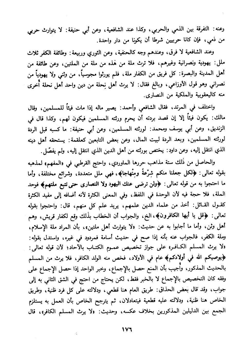 والحاصل من ذلك ستة مذاهب حررها الماوردي، واحتج القرطبي في "المفهم" لمذهبه بقوله تعالى: {لِكُلٍّ جَعَلْنَا مِنْكُمْ شِرْعَةً وَمِنْهَاجًا} , فهي ملل متعددة، وشرائع مختلفة، وأما ما احتجوا به من قوله تعالى: {وَلَنْ تَرْضَى عَنْكَ الْيَهُودُ وَلَا النَّصَارَى حَتَّى تَتَّبِعَ مِلَّتَهُمْ} فوحد الملة، فلا حجة فيه لأن الوحدة في اللفظ، وفي المعنى الكثرة لأنه أضافه إلى مفيد الكثرة كقول القائل: أخذ من علماء الدين علمهم، يريد علم كل منهم، قال: واحتجوا بقوله تعالى: {قُلْ يَا أَيُّهَا الْكَافِرُونَ}، الخ، والجواب أن الخطاب بذلك وقع لكفار قريش، وهم أهل وثن، وأما ما أجابوا به عن حديث: "لا يتوارث أهل ملتين"، بأن المراد ملة الإِسلام، وملة الكفر، فالجواب عنه بأنه إذا صح في حديث أسامة فمردود في غيره، واستدل بقوله: "لا يرث المسلم الكافر" على جواز تخصيص عموم الكتاب بالآحاد؛ لأن قوله تعالى: {يُوصِيكُمُ اللَّهُ فِي أَوْلَادِكُمْ} عام في الأولاد، فخص منه الولد الكافر، فلا يرث من المسلم بالحديث المذكور، وأجيب بأن المنع حصل بالإجماع، وخبر الواحد إذا حصل الإجماع على وفقه كان التخصيص بالإجماع لا بالخبر فقط، لكن يحتاج من احتج في الشق الثاني به إلى جواب، وقد قال بعض الحذاق: طريق العام هنا قطعي، ودلالته على كل فرد ظنية، وطريق الخاص هنا ظنية، ودلالته عليه قطعية فيتعادلان، ثم يترجح الخاص بأن العمل به يستلزم الجمع بين الدليلين المذكورين بخلاف عكسه، وحديث: "لا يرث المسلم الكافر", قال