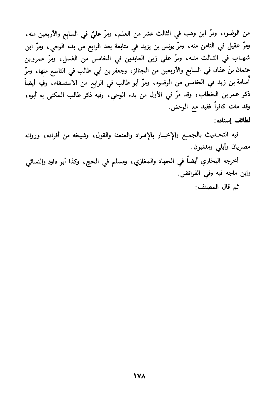 من الوضوء، ومرَّ ابن وهب في الثالث عشر من العلم، ومرَّ عليّ في السابع والأربعين منه، ومرَّ عقيل في الثامن منه، ومرّ يونس بن يزيد في متابعة بعد الرابع من بدء الوحي، ومرّ ابن شهاب في الثالث منه، ومرَّ علي زين العابدين في الخامس من الغسل، ومرَّ عمرو بن عثمان بن عفان في السابع والأربعين من الجنائز، وجعفر بن أبي طالب في التاسع منها، ومرَّ أُسامة بن زيد في الخامس من الوضوء ومرَّ أبو طالب في الرابع من الاستسقاء، وفيه أيضًا ذكر عمر بن الخطاب، وقد مرَّ في الأول من بدء الوحي، وفيه ذكر طالب المكنى به أبوه، وقد مات كافرًا فقيد مع الوحش.