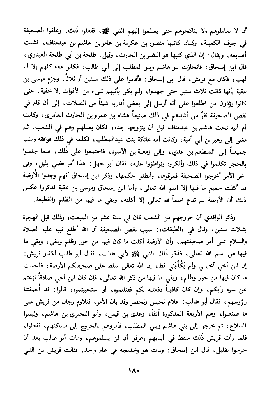 أن لا يعاملوهم ولا يناكحوهم حتى يسلموا إليهم النبي -صلى الله عليه وسلم-، ففعلوا ذلك، وعلقوا الصحيفة في جوف الكعبة، وكان كاتبها منصور بن عكرمة بن عامر بن هاشم بن عبد مناف، فشلت أصابعه، ويقال: إن الذي كتبها هو النضر بن الحارث، وقيل: طلحة بن أبي طلحة العبدري، قال ابن إسحاق: فانحازت بنو هاشم وبنو المطلب إلى أبي طالب، فكانوا معه كلهم إلا أبا لهب، فكان مع قريش، قال ابن إسحاق: فأقاموا على ذلك سنتين أو ثلاثًا، وجزم موسى بن عقبة بأنها كانت ثلاث سنين حتى جهدوا, ولم يكن يأتيهم شيء من الأقوات إلا خفية، حتى كانوا يؤذون من اطلعوا على أنه أرسل إلى بعض أقاربه شيئًا من الصلات، إلى أن قام في نقض الصحيفة نفرٌ من أشدهم في ذلك صنيعًا هشام بن عمرو بن الحارث العامري، وكانت أم أبيه تحت هاشم بن عبد مناف قبل أن يتزوجها جده، فكان يصلهم وهم في الشعب، ثم مشى إلى زهير بن أبي أمية، وكانت أمه عاتكة بنت عبد المطلب، فكلمه في ذلك فوافقه ومشيا جميعًا إلى المطعم بن عدي، وإلى زمعة بن الأسود، فاجتمعوا على ذلك، فلما جلسوا بالحجر تكلموا في ذلك وأنكروه وتواطؤوا عليه، فقال أبو جهل: هذا أمر قضي بليل، وفي آخر الأمر أخرجوا الصحيفة فمزقوها، وأبطلوا حكمها، وذكر ابن إسحاق أنهم وجدوا الأرضة قد أكلت جميع ما فيها إلا اسم الله تعالى، وأما ابن إسحاق وموسى بن عقبة فذكروا عكس ذلك أن الأرضة لم تدع اسمًا لله تعالى إلا أكلته، وبقي ما فيها من الظلم والقطيعة.