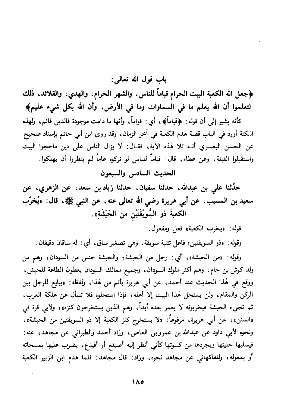 حَدَّثَنَا عَلِيُّ بْنُ عَبْدِ اللَّهِ، حَدَّثَنَا سُفْيَانُ، حَدَّثَنَا زِيَادُ بْنُ سَعْدٍ، عَنِ الزُّهْرِيِّ، عَنْ سَعِيدِ بْنِ الْمُسَيَّبِ، عَنْ أَبِي هُرَيْرَةَ رضي الله عنه، عَنِ النَّبِيِّ -صلى الله عليه وسلم- قَالَ: "يُخَرِّبُ الْكَعْبَةَ ذُو السُّوَيْقَتَيْنِ مِنَ الْحَبَشَةِ".