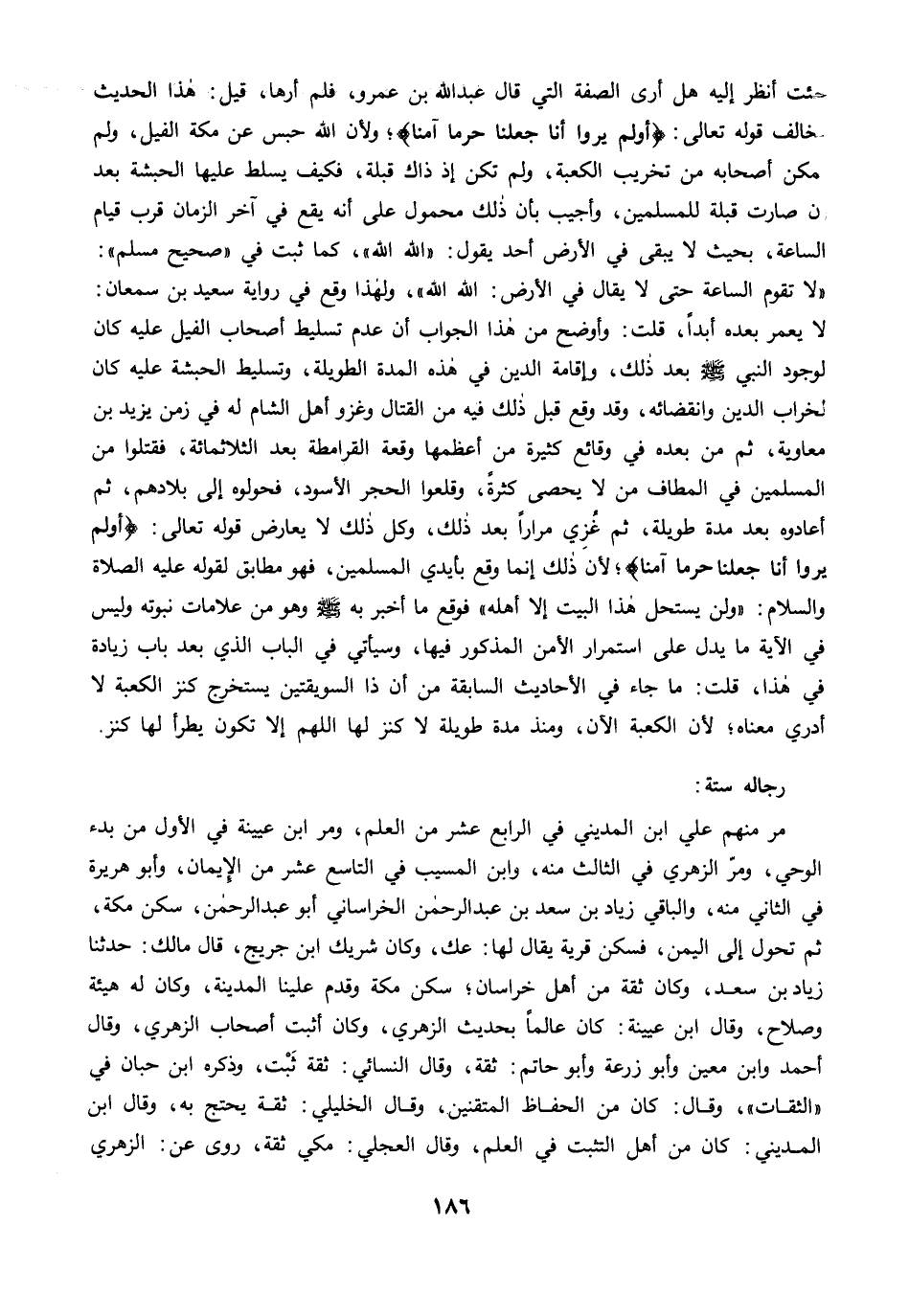 جئت انظر إليه هل أرى الصفة التي قال عبد الله بن عمرو، فلم أرها، قيل: هذا الحديث يخالف قوله تعالى: {أَوَلَمْ يَرَوْا أَنَّا جَعَلْنَا حَرَمًا آمِنًا}؛ ولأن الله حبس عن مكة الفيل، ولم يمكن أصحابه من تخريب الكعبة، ولم تكن إذ ذاك قبلة، فكيف يسلط عليها الحبشة بعد إن صارت قبلة للمسلمين، وأجيب بأن ذلك محمول على أنه يقع في آخر الزمان قرب قيام الساعة، بحيث لا يبقى في الأرض أحد يقول: "الله الله"، كما ثبت في "صحيح مسلم": "لا تقوم الساعة حتى لا يقال في الأرض: الله الله"، ولهذا وقع في رواية سعيد بن سمعان: لا يعمر بعده أبدًا، قلت: وأوضح من هذا الجواب أن عدم تسليط أصحاب الفيل عليه كان لوجود النبي -صلى الله عليه وسلم- بعد ذلك، وإقامة الدين في هذه المدة الطويلة، وتسليط الحبشة عليه كان لخراب الدين وانقضائه، وقد وقع قبل ذلك فيه من القتال وغزو أهل الشام له في زمن يزيد بن معاوية، ثم من بعده في وقائع كثيرة من أعظمها وقعة القرامطة بعد الثلاثمائة، فقتلوا من المسلمين في المطاف من لا يحصى كثرةً، وقلعوا الحجر الأسود، فحولوه إلى بلادهم، ثم أعادوه بعد مدة طويلة، ثم غُزِي مرارًا بعد ذلك، وكل ذلك لا يعارض قوله تعالى: {أَوَلَمْ يَرَوْا أَنَّا جَعَلْنَا حَرَمًا آمِنًا}؛ لأن ذلك إنما وقع بأيدي المسلمين، فهو مطابق لقوله عليه الصلاة والسلام: "ولن يستحل هذا البيت إلا أهله" فوقع ما أخبر به -صلى الله عليه وسلم- وهو من علامات نبوته وليس في الآية ما يدل على استمرار الأمن المذكور فيها، وسيأتي في الباب الذي بعد باب زيادة في هذا، قلت: ما جاء في الأحاديث السابقة من أن ذا السويقتين يستخرج كنز الكعبة لا أدري معناه؛ لأن الكعبة الآن، ومنذ مدة طويلة لا كنز لها اللهم إلا تكون يطرأ لها كنز.