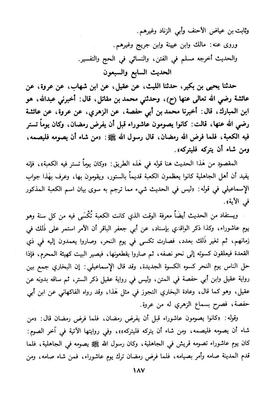 حَدَّثَنَا يَحْيَى بْنُ بُكَيْرٍ، حَدَّثَنَا اللَّيْثُ، عَنْ عُقَيْلٍ، عَنِ ابْنِ شِهَابٍ، عَنْ عُرْوَةَ، عَنْ عَائِشَةَ رضي الله عنها (ح). وَحَدَّثَنِي مُحَمَّدُ بْنُ مُقَاتِلٍ، قَالَ: أَخْبَرَنِي عَبْدُ اللَّهِ، هُوَ ابْنُ الْمُبَارَكِ، قَالَ: أَخْبَرَنَا مُحَمَّدُ بْنُ أَبِي حَفْصَةَ، عَنِ الزُّهْرِيِّ، عَنْ عُرْوَةَ، عَنْ عَائِشَةَ رضي الله عنها، قَالَتْ: كَانُوا يَصُومُونَ عَاشُورَاءَ قَبْلَ أَنْ يُفْرَضَ رَمَضَانُ، وَكَانَ يَوْمًا تُسْتَرُ فِيهِ الْكَعْبَةُ، فَلَمَّا فَرَضَ اللَّهُ رَمَضَانَ، قَالَ رَسُولُ اللَّهِ -صلى الله عليه وسلم-: "مَنْ شَاءَ أَنْ يَصُومَهُ فَلْيَصُمْهُ، وَمَنْ شَاءَ أَنْ يَتْرُكَهُ فَلْيَتْرُكْهُ".