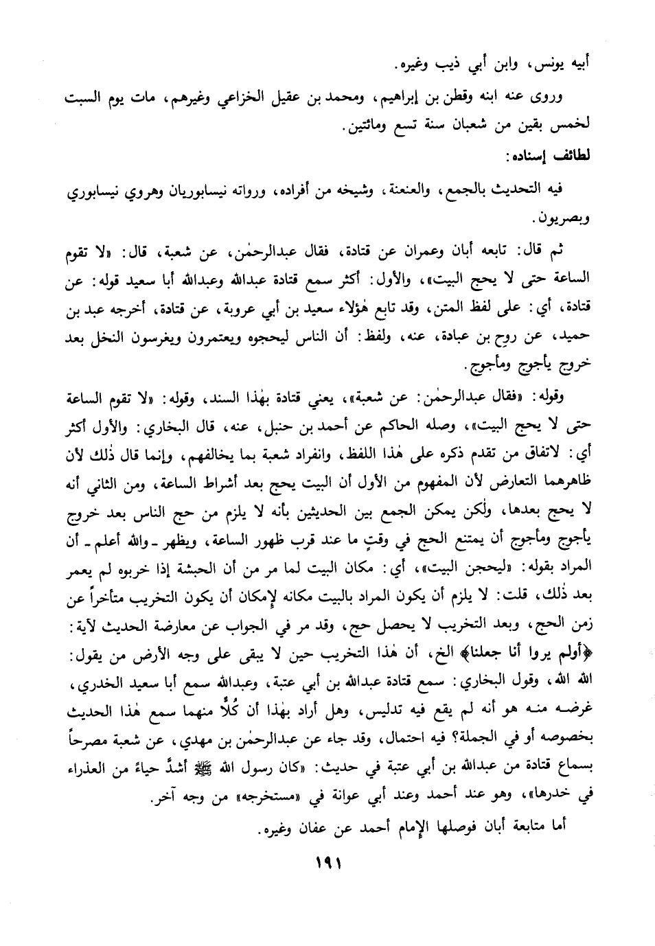 وقوله: "فقال عبد الرحمن: عن شعبة"، يعني قتادة بهذا السند، وقوله: "لا تقوم الساعة حتى لا يحج البيت"، وصله الحاكم عن أحمد بن حنبل، عنه، قال البخاري: والأول أكثر أي: لاتفاق من تقدم ذكره على هذا اللفظ، وانفراد شعبة بما يخالفهم، وإنما قال ذلك لأن ظاهرهما التعارض لأن المفهوم من الأول أن البيت يحج بعد أشراط الساعة، ومن الثاني أنه لا يحج بعدها, ولكن يمكن الجمع بين الحديثين بأنه لا يلزم من حج الناس بعد خروج يأجوج ومأجوج أن يمتنع الحج في وقتٍ ما عند قرب ظهور الساعة، ويظهر -والله أعلم- أن المراد بقوله: "ليحجن البيت"، أي: مكان البيت لما مرَّ من أن الحبشة إذا خربوه لم يعمر بعد ذلك، قلت: لا يلزم أن يكون المراد بالبيت مكانه لإمكان أن يكون التخريب متأخرًا عن زمن الحج، وبعد التخريب لا يحصل حج، وقد مرَّ في الجواب عن معارضة الحديث لآية: {أَوَلَمْ يَرَوْا أَنَّا جَعَلْنَا} الخ، أن هذا التخريب حين لا يبقى على وجه الأرض من يقول: الله الله، وقول البخاري: سمع قتادة عبد الله بن أبي عتبة، وعبد الله سمع أبا سعيد الخدري، غرضه منه هو أنه لم يقع فيه تدليس، وهل أراد بهذا أن كُلاًّ منهما سمع هذا الحديث بخصوصه أو في الجملة؟ فيه احتمال، وقد جاء عن عبد الرحمن بن مهدي، عن شعبة مصرحًا بسماع قتادة من عبد الله بن أبي عتبة في حديث: "كان رسول الله -صلى الله عليه وسلم- أشدَّ حياءً من العذراء في خدرها"، وهو عند أحمد وعند أبي عوانة في "مستخرجه" من وجه آخر.