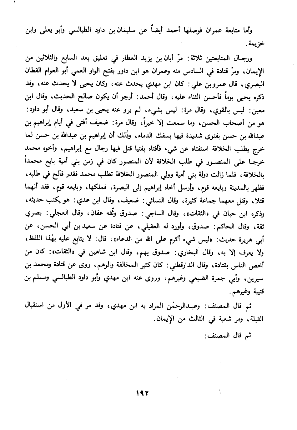 ورجال المتابعتين ثلاثة: مرَّ أبان بن يزيد العطار في تعليق بعد السابع والثلاثين من الإيمان, ومرّ قتادة في السادس منه وعمران هو ابن داود بفتح الواو العمي أبو العوام القطان البصري، قال عمرو بن علي: كان ابن مهدي يحدث عنه، وكان يحيى لا يحدث عنه، وقد ذكره يحيى يومًا فأحسن الثناء عليه، وقال أحمد: أرجو أن يكون صالح الحديث، وقال ابن معين: ليس بالقوي، وقال مرة: ليس بشيء، لم يرو عنه يحيى بن سعيد، وقال أبو داود: هو من أصحاب الحسن، وما سمعت إلا خيرًا، وقال مرة: ضعيف أفتى في أيام إبراهيم بن عبد الله بن حسن بفتوى شديدة فيها بسفك الدماء، وذلك أن إبراهيم بن عبد الله بن حسن لما خرج يطلب الخلافة استفتاه عن شيء فأفتاه بفتيا قتل فيها رجال مع إبراهيم، وأخوه محمد خرجا على المنصور في طلب الخلافة لأن المنصور كان في زمن بني أمية بايع محمدًا بالخلافة، فلما زالت دولة بني أممة وولي المنصور الخلافة تطلب محمد فقدر فألح في طلبه، فظهر بالمدينة ويايعه قوم، وأرسل أخاه إبراهيم إلى البصرة، فملكها، وبايعه قوم، فقد أنهما قتلا، وقتل معهما جماعة كثيرة، وقال النسائي: ضعيف، وقال ابن عدي: هو يكتب حديثه، وذكره ابن حبان في "الثقات"، وقال الساجي: صدوق وثّقه عفان، وقال العجلي: بصري ثقة، وقال الحكم: صدوق، وأورد له العقيلي، عن قتادة عن سعيد بن أبي الحسن، عن أبي هريرة حديث: "ليس شيء أكرم على الله من الدعاء", قال: لا يتابع عليه بهذا اللفظ، ولا يعرف إلا به، وقال البخاري: صدوق يهم، وقال ابن شاهين في "الثقات": كان من أخص الناس بقتادة، وقال الدارقطني: كان كثير المخالفة والوهم، روى عن قتادة ومحمد بن سيرين، وأبي جمرة الضبعي وغيرهم، وروى عنه ابن مهدي وأبو داود الطيالسي ومسلم بن قتيبة وغيرهم.