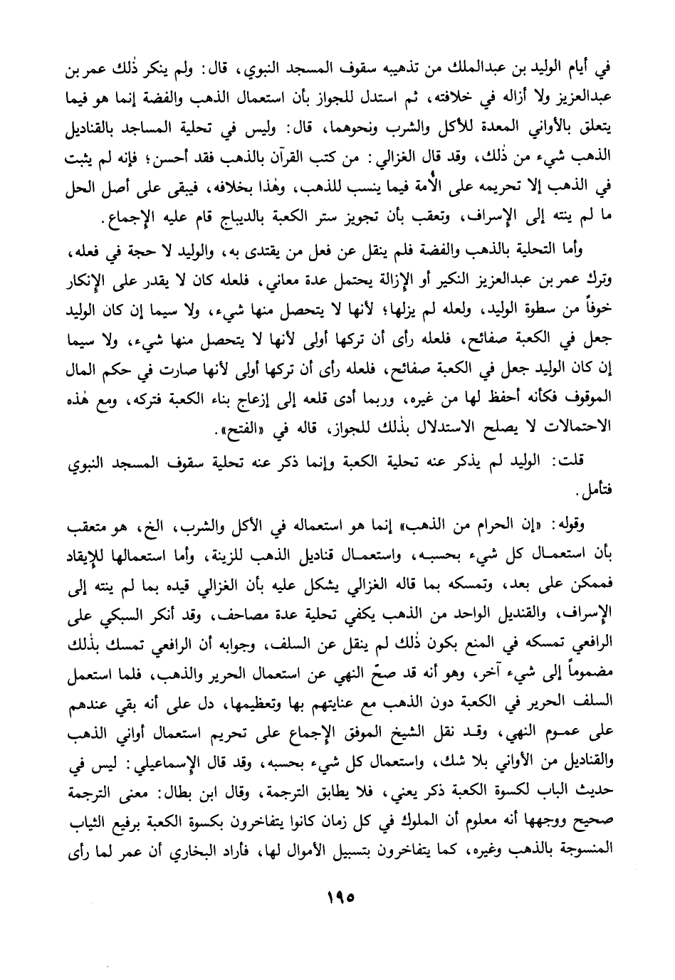 في أيام الوليد بن عبد الملك من تذهيبه سقوف المسجد النبوي، قال: ولم ينكر ذلك عمر بن عبد العزيز ولا أزاله في خلافته، ثم استدل للجواز بأن استعمال الذهب والفضة إنما هو فيما يتعلق بالأواني المعدة للأكل والشرب ونحوهما، قال: وليس في تحلية المساجد بالقناديل الذهب شيء من ذلك، وقد قال الغزالي: من كتب القرآن بالذهب فقد أحسن؛ فإنه لم يثبت في الذهب إلا تحريمه على الأمة فيما ينسب للذهب، وهذا بخلافه، فيبقى على أصل الحل ما لم ينته إلى الإسراف، وتعقب بأن تجويز ستر الكعبة بالديباج قام عليه الإجماع.
