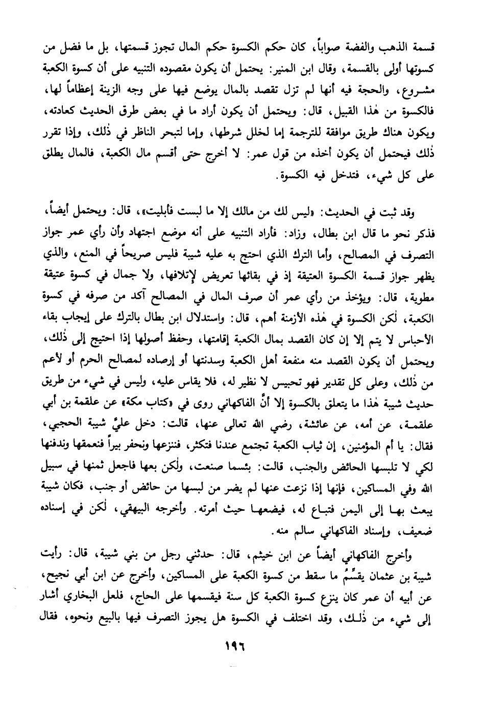 وقد ثبت في الحديث: "ليس لك من مالك إلا ما لبست فأبليت"، قال: ويحتمل أيضًا، فذكر نحو ما قال ابن بطال، وزاد: فأراد التنبيه على أنه موضع اجتهاد وأن رأي عمر جواز التصرف في المصالح، وأما الترك الذي احتج به عليه شيبة فليس صريحًا في المنع، والذي يظهر جواز قسمة الكسوة العتيقة إذ في بقائها تعريض لإتلافها, ولا جمال في كسوة عتيقة مطوية، قال: ويؤخذ من رأي عمر أن صرف المال في المصالح آكد من صرفه في كسوة الكعبة، لكن الكسوة في هذه الأزمنة أهم، قال: واستدلال ابن بطال بالترك على إيجاب بقاء الأحباس لا يتم إلا إن كان القصد بمال الكعبة إقامتها، وحفظ أصولها إذا احتيج إلى ذلك، ويحتمل أن يكون القصد منه منفعة أهل الكعبة وسدنتها أو إرصاده لمصالح الحرم أو لأعم من ذلك، وعلى كل تقدير فهو تحبيس لا نظير له، فلا يقاس عليه، ولشى في شيء من طريق حديث شيبة هذا ما يتعلق بالكسوة إلا أنَّ الفاكهاني روى في "كتاب مكة" عن علقمة بن أبي علقمة، عن أمه، عن عائشة، رضي الله تعالى عنها، قالت: دخل علي شيبة الحجبي، فقال: يا أم المؤمنين، إن ثياب الكعبة تجتمع عندنا فتكثر، فننزعها ونحفر بيرًا فنعمقها وندفنها لكي لا تلبسها الحائض والجنب، قالت: بئسما صنعت، ولكن بعها فاجعل ثمنها في سبيل الله وفي المساكين، فإنها إذا نزعت عنها لم يضر من لبسها من حائض أو جنب، فكان شيبة يبعث بها إلى اليمن فتباع له، فيضعها حيث أمرته. وأخرجه البيهقي، لكن في إسناده ضعيف، وإسناد الفاكهاني سالم منه.