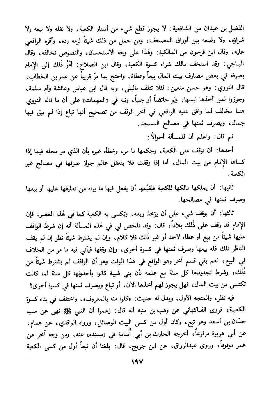 ثالثها: أن يوقف شيء على أن يؤخذ ربعه، وتكسى به الكعبة كما في هذا العصر، فإن الإِمام قد وقف على ذلك بلادًا، قال: وقد تلخص لي في هذه المسألة أنه إن شرط الواقف عليها شيئًا من بيع أو عطاء لأحد أو غير ذلك فلا كلام، وإن لم يشترط شيئًا نظر إن لم يقف الناظر تلك فله بيعها وصرف ثمنها في كسوة أخرى، وإن وقفها فيأتي فيه ما مرَّ من الخلاف في البيع، نعم بقي قسم آخر وهو الواقع في هذا الوقت وهو أن الواقف لم يشترط شيئًا من ذلك، وشرط تجديدها كل سنة مع علمه بأن بني شيبة كانوا يأخذونها كل سنة لما كانت تكتسى من بيت المال, فهل يجوز لهم أخذها الآن، أو تباع ويصرف ثمنها في كسوة أخرى؟
