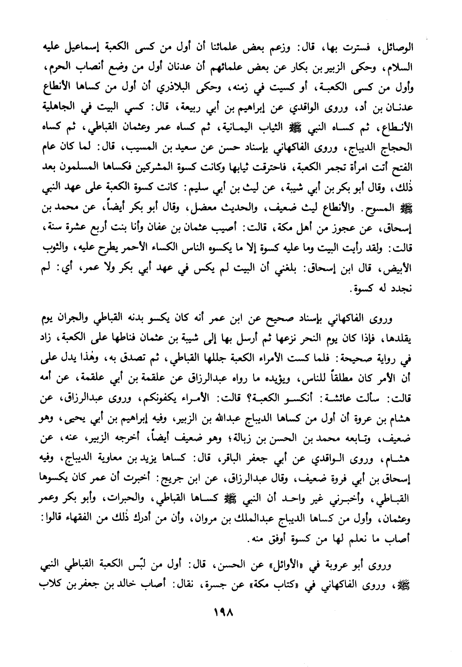 وروى الفاكهاني بإسناد صحيح عن ابن عمر أنه كان يكسو بدنه القباطي والجران يوم يقلدها، فإذا كان يوم النحر نزعها ثم أرسل بها إلى شيبة بن عثمان فناطها على الكعبة، زاد في رواية صحيحة: فلما كست الأمراء الكعبة جللها القباطي، ثم تصدق به، وهذا يدل على أن الأمر كان مطلقًا للناس، ويؤيده ما رواه عبد الرزاق عن علقمة بن أبي علقمة، عن أمه قالت: سألت عائشة: أنكسو الكعبة؟ قالت: الأمراء يكفونكم، وروى عبد الرزاق، عن هشام بن عروة أن أول من كساها الديباج عبد الله بن الزبير، وفيه إبراهيم بن أبي يحيى، وهو ضعيف، وتابعه محمد بن الحسن بن زبالة؛ وهو ضعيف أيضًا، أخرجه الزبير، عنه، عن هشام، وروى الواقدي عن أبي جعفر الباقر، قال: كساها يزيد بن معاوية الديباج، وفيه إسحاق بن أبي فروة ضعيف، وقال عبد الرزاق، عن ابن جريج: أخبرت أن عمر كان يكسوها القباطي، وأخبرني غير واحد أن النبي -صلى الله عليه وسلم- كساها القباطي، والحبرات، وأبو بكر وعمر وعثمان، وأول من كساها الديباج عبد الملك بن مروان، وأن من أدرك ذلك من الفقهاء قالوا: أصاب ما نعلم لها من كسوة أوفق منه.