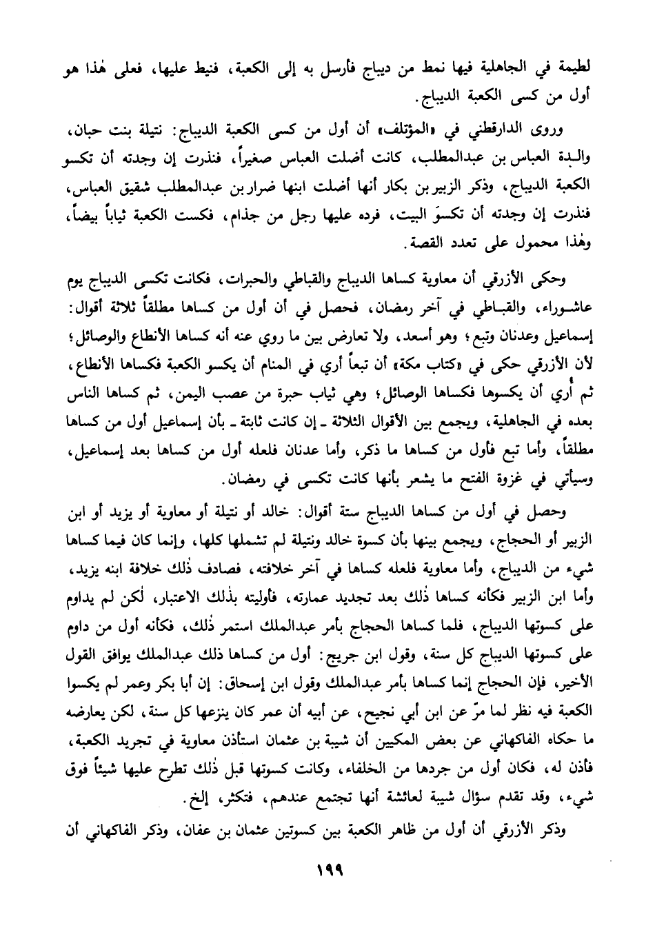 وحصل في أول من كساها الديباج ستة أقوال: خالد أو نتيلة أو معاوية أو يزيد أو ابن الزبير أو الحجاج، ويجمع بينها بأن كسوة خالد ونتيلة لم تشملها كلها، وإنما كان فيما كساها شيء من الديباج، وأما معاوية فلعله كساها في آخر خلافته، فصادف ذلك خلافة ابنه يزيد، وأما ابن الزبير فكأنه كساها ذلك بعد تجديد عمارته، فأوليته بذلك الاعتبار، لكن لم يداوم على كسوتها الديباج، فلما كساها الحجاج بأمر عبد الملك استمر ذلك، فكأنه أول من داوم على كسوتها الديباج كل سنة، وقول ابن جريج: أول من كساها ذلك عبدالملك يوافق القول الأخير، فإن الحجاج إنما كساها بأمر عبد الملك وقول ابن إسحاق: إن أبا بكر وعمر لم يكسوا الكعبة فيه نظر لما مرَّ عن ابن أبي نجيح، عن أبيه أن عمر كان ينزعها كل سنة، لكن يعارضه ما حكاه الفاكهاني عن بعض المكيين أن شيبة بن عثمان استأذن معاوية في تجريد الكعبة، فأذن له، فكان أول من جردها من الخلفاء، وكانت كسوتها قبل ذلك تطرح عليها شيئًا فوق شيء، وقد تقدم سؤال شيبة لعائشة أنها تجتمع عندهم، فتكثر، إلخ.