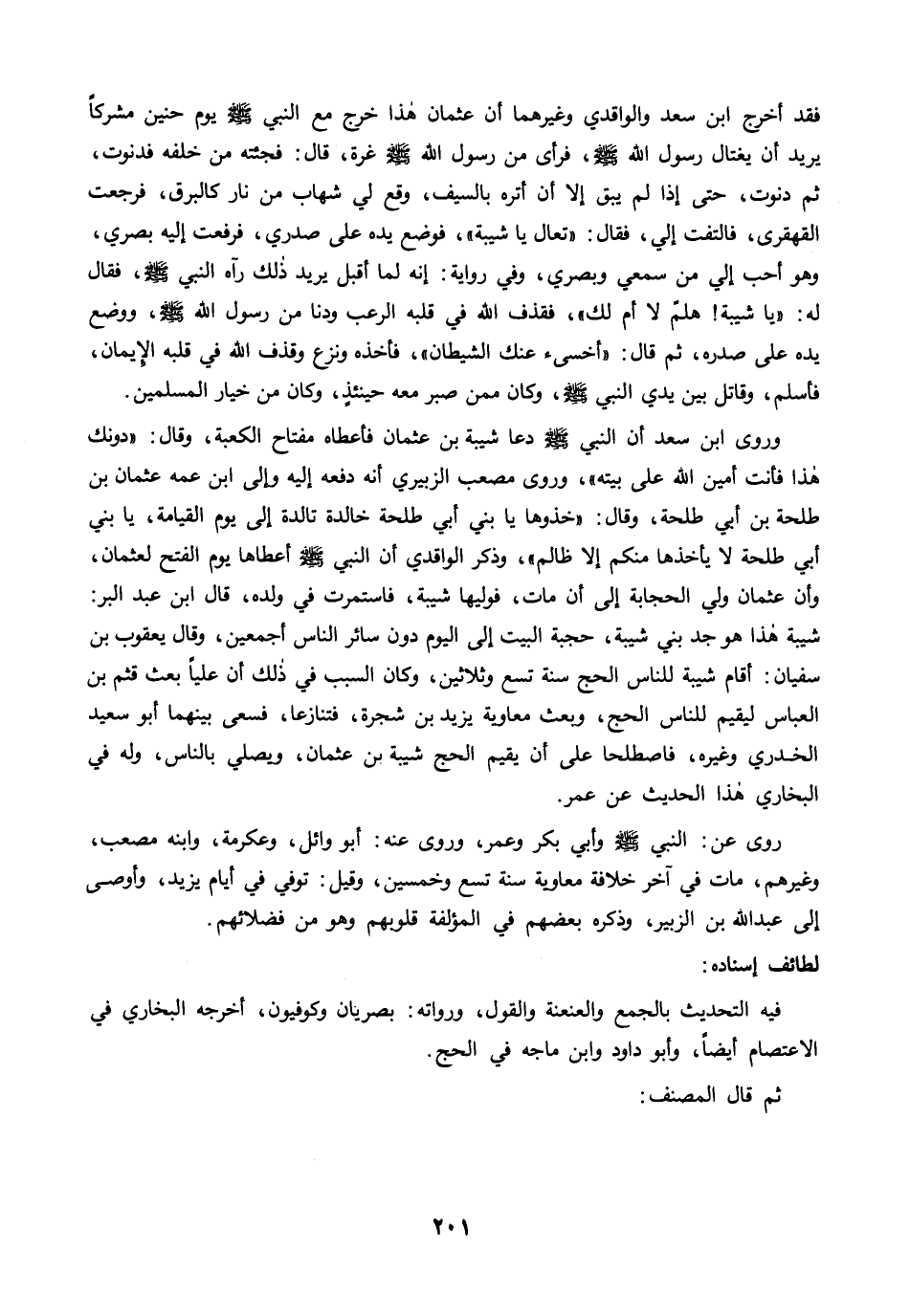 وروى ابن سعد أن النبي -صلى الله عليه وسلم- دعا شيبة بن عثمان فأعطاه مفتاح الكعبة، وقال: "دونك هذا فأنت أمين الله على بيته"، وروى مصعب الزبيري أنه دفعه إليه وإلى ابن عمه عثمان بن طلحة بن أي طلحة، وقال: "خذوها يا بني أبي طلحة خالدة تالدة إلى يوم القيامة، يا بني أبي طلحة لا يأخذها منكم إلا ظالم"، وذكر الواقدي أن النبي -صلى الله عليه وسلم- أعطاها يوم الفتح لعثمان، وأن عثمان ولي الحجابة إلى أن مات، فوليها شيبة، فاستمرت في ولده، قال ابن عبد البر: شيبة هذا هو جد بني شيبة، حجبة البيت إلى اليوم دون سائر الناس أجمعين، وقال يعقوب بن سفيان: أقام شيبة للناس الحج سنة تسع وثلاثين، وكان السبب في ذلك أن عليًا بعث قثم بن العباس ليقيم للناس الحج، ويعث معاوية يزيد بن شجرة، فتنازعا، فسعى بينهما أبو سعيد الخدري وغيره، فاصطلحا على أن يقيم الحج شيبة بن عثمان، ويصلي بالناس، وله في البخاري هذا الحديث عن عمر.