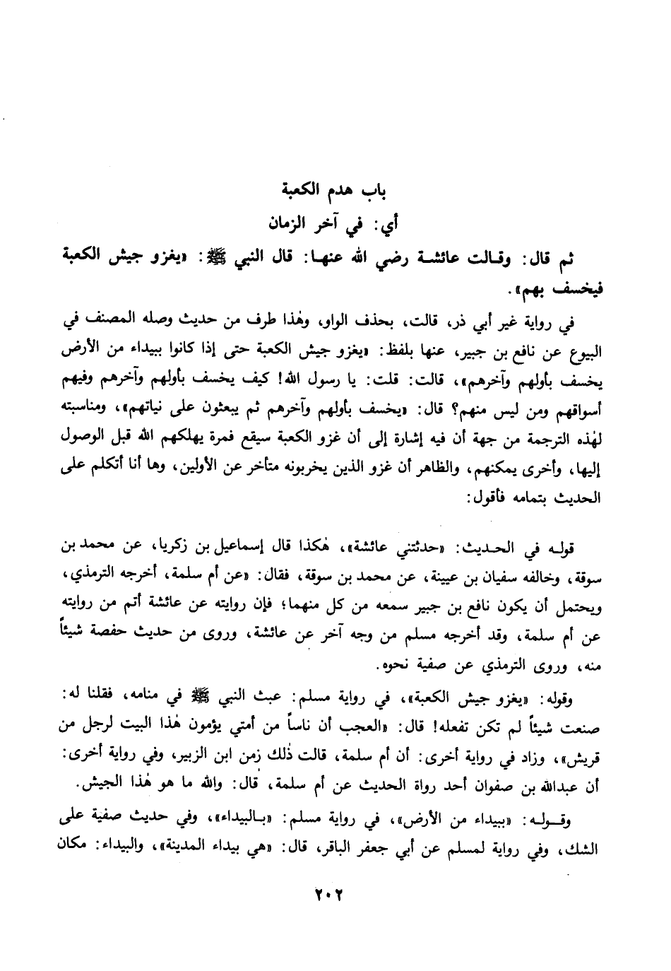 ثم قال: قَالَتْ عَائِشَةُ رضي الله عنها: قَالَ النَّبِيُّ -صلى الله عليه وسلم-: "يَغْزُو جَيْشٌ الْكَعْبَةَ، فَيُخْسَفُ بِهِمْ".