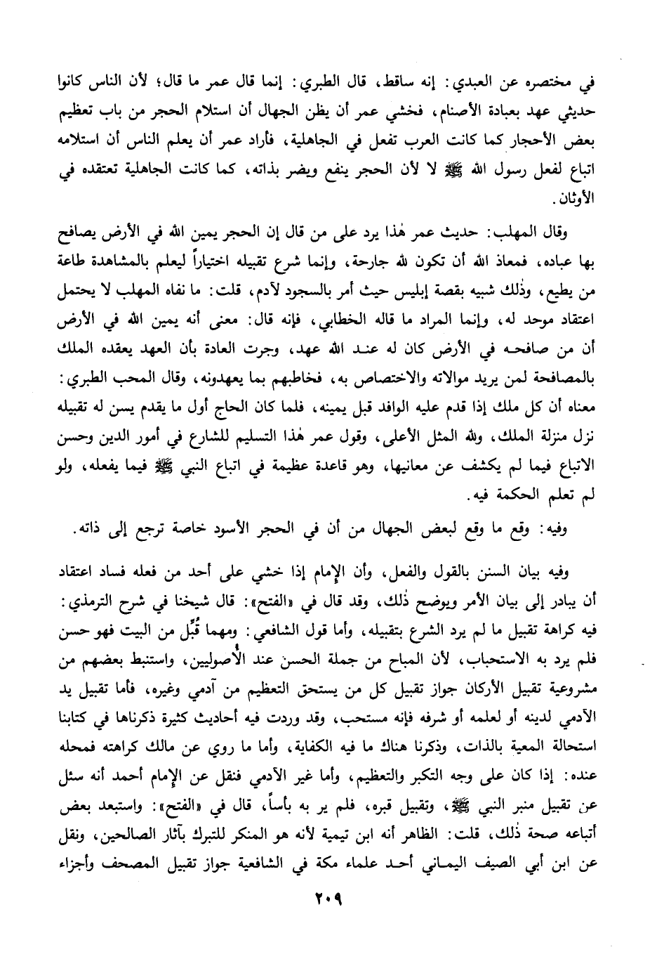 في مختصره عن العبدي: إنه ساقط، قال الطبري: إنما قال عمر ما قال؛ لأن الناس كانوا حديثي عهد بعبادة الأصنام، فخشي عمر أن يظن الجهال أن استلام الحجر من باب تعظيم بعض الأحجار كما كانت العرب تفعل في الجاهلية، فأراد عمر أن يعلم الناس أن استلامه اتباع لفعل رسول الله -صلى الله عليه وسلم- لا لأن الحجر ينفع ويضر بذاته، كما كانت الجاهلية تعتقده في الأوثان.