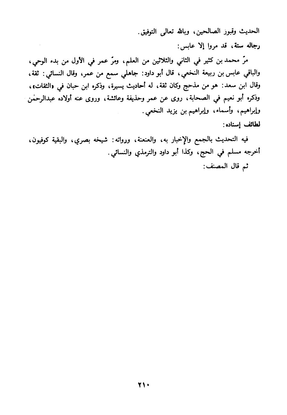 فيه التحديث بالجمع والإخبار به، والعنعنة، ورواته: شيخه بصري، والبقية كوفيون، أخرجه مسلم في الحج، وكذا أبو داود والترمذي والنسائي.