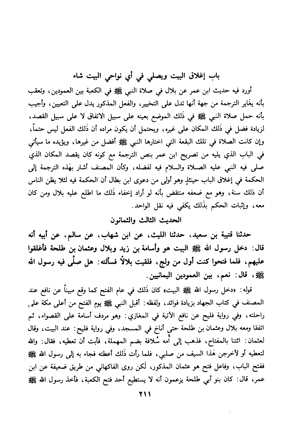 حَدَّثَنَا قُتَيْبَةُ بْنُ سَعِيدٍ، حَدَّثَنَا اللَّيْثُ، عَنِ ابْنِ شِهَابٍ، عَنْ سَالِمٍ، عَنْ أَبِيهِ أَنَّهُ قَالَ: دَخَلَ رَسُولُ اللَّهِ -صلى الله عليه وسلم- الْبَيْتَ هُوَ وَأُسَامَةُ بْنُ زَيْدٍ، وَبِلاَلٌ، وَعُثْمَانُ بْنُ طَلْحَةَ، فَأَغْلَقُوا عَلَيْهِمْ فَلَمَّا فَتَحُوا، كُنْتُ أَوَّلَ مَنْ وَلَجَ، فَلَقِيتُ بِلاَلاً فَسَأَلْتُهُ: هَلْ صَلَّى فِيهِ رَسُولُ اللَّهِ -صلى الله عليه وسلم- قَالَ: نَعَمْ، بَيْنَ الْعَمُودَيْنِ الْيَمَانِيَيْنِ.