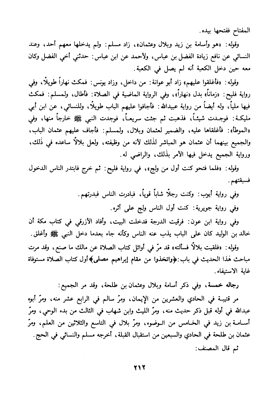 مرَّ قتيبة في الحادي والعشرين من الإيمان, ومرَّ سالم في الرابع عشر منه، ومرَّ أبوه عبد الله في أوله قبل ذكر حديث منه، ومرَّ الليث وابن شهاب في الثالث من بدء الوحي، ومرَّ أسامة بن زيد في الخامس من الوضوء، ومرَّ بلال في التاسع والثلاثين من العلم، ومرَّ عثمان بن طلحة في الحادي والسبعين من استقبال القبلة، أخرجه مسلم والنسائي في الحج.