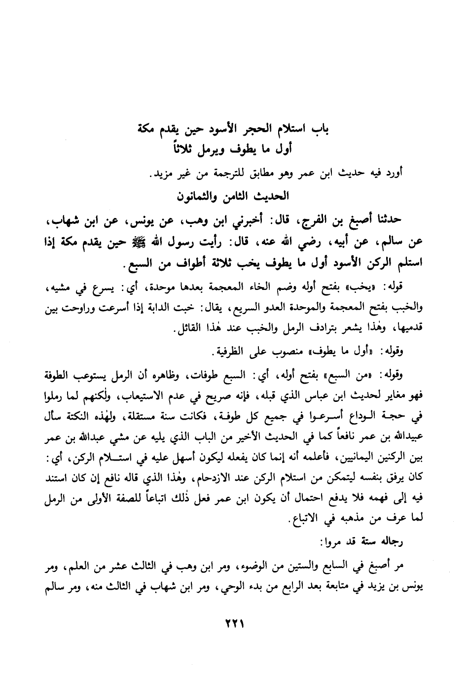 حَدَّثَنَا أَصْبَغُ بْنُ الْفَرَجِ، قال: أَخْبَرَنِي ابْنُ وَهْبٍ، عَنْ يُونُسَ، عَنِ ابْنِ شِهَابٍ، عَنْ سَالِمٍ، عَنْ أَبِيهِ، رضي الله عنه قَالَ: رَأَيْتُ رَسُولَ اللَّهِ -صلى الله عليه وسلم- حِينَ يَقْدَمُ مَكَّةَ، إِذَا اسْتَلَمَ الرُّكْنَ الأَسْوَدَ أَوَّلَ مَا يَطُوفُ يَخُبُّ ثَلاَثَةَ أَطْوَافٍ مِنَ السَّبْعِ.