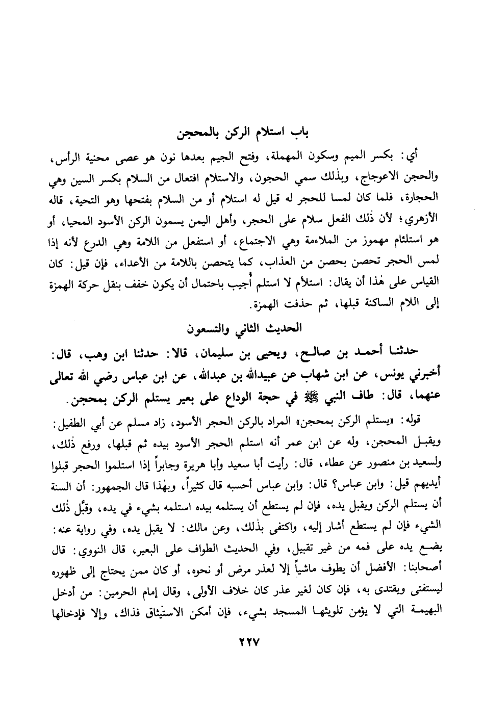 حَدَّثَنَا أَحْمَدُ بْنُ صَالِحٍ، وَيَحْيَى بْنُ سُلَيْمَانَ، قَالاَ: حَدَّثَنَا ابْنُ وَهْبٍ، قَالَ: أَخْبَرَنِي يُونُسُ، عَنِ ابْنِ شِهَابٍ عَنْ عُبَيْدِ اللَّهِ بْنِ عَبْدِ اللَّهِ، عَنِ ابْنِ عَبَّاسٍ رضي الله عنهما، قَالَ: طَافَ النَّبِيُّ -صلى الله عليه وسلم- فِي حَجَّةِ الْوَدَاعِ عَلَى بَعِيرٍ، يَسْتَلِمُ الرُّكْنَ بِمِحْجَنٍ.