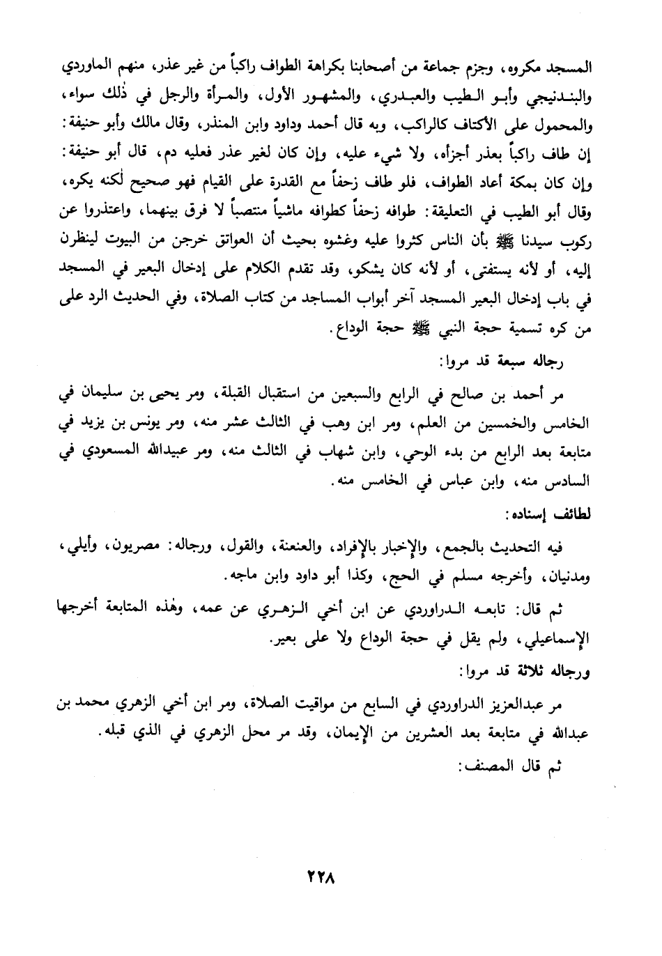 المسجد مكروه، وجزم جماعة من أصحابنا بكراهة الطواف راكبا من غير عذر، منهم الماوردي والبندنيجي وأبو الطيب والعبدري، والمشهور الأول، والمرأة والرجل في ذلك سواء، والمحمول على الأكتاف كالراكب، وبه قال أحمد وداود وابن المنذر، وقال مالك وأبو حنيفة: إن طاف راكبًا بعذر أجزأه، ولا شيء عليه، وإن كان لغير عذر فعليه دم، قال أبو حنيفة: وإن كان بمكة أعاد الطواف، فلو طاف زحفًا مع القدرة على القيام فهو صحيح لكنه يكره، وقال أبو الطيب في التعليقة: طوافه زحفا كطوافه ماشيًا منتصبًا لا فرق بينهما، واعتذروا عن ركوب سيدنا -صلى الله عليه وسلم- بأن الناس كثروا عليه وغشوه بحيث أن العواتق خرجن من البيوت لينظرن إليه، أو لأنه يستفتى، أو لأنه كان يشكو، وقد تقدم الكلام على إدخال البعير في المسجد في باب إدخال البعير المسجد آخر أبواب المساجد من كتاب الصلاة، وفي الحديث الرد على من كره تسمية حجة النبي -صلى الله عليه وسلم- حجة الوداع.