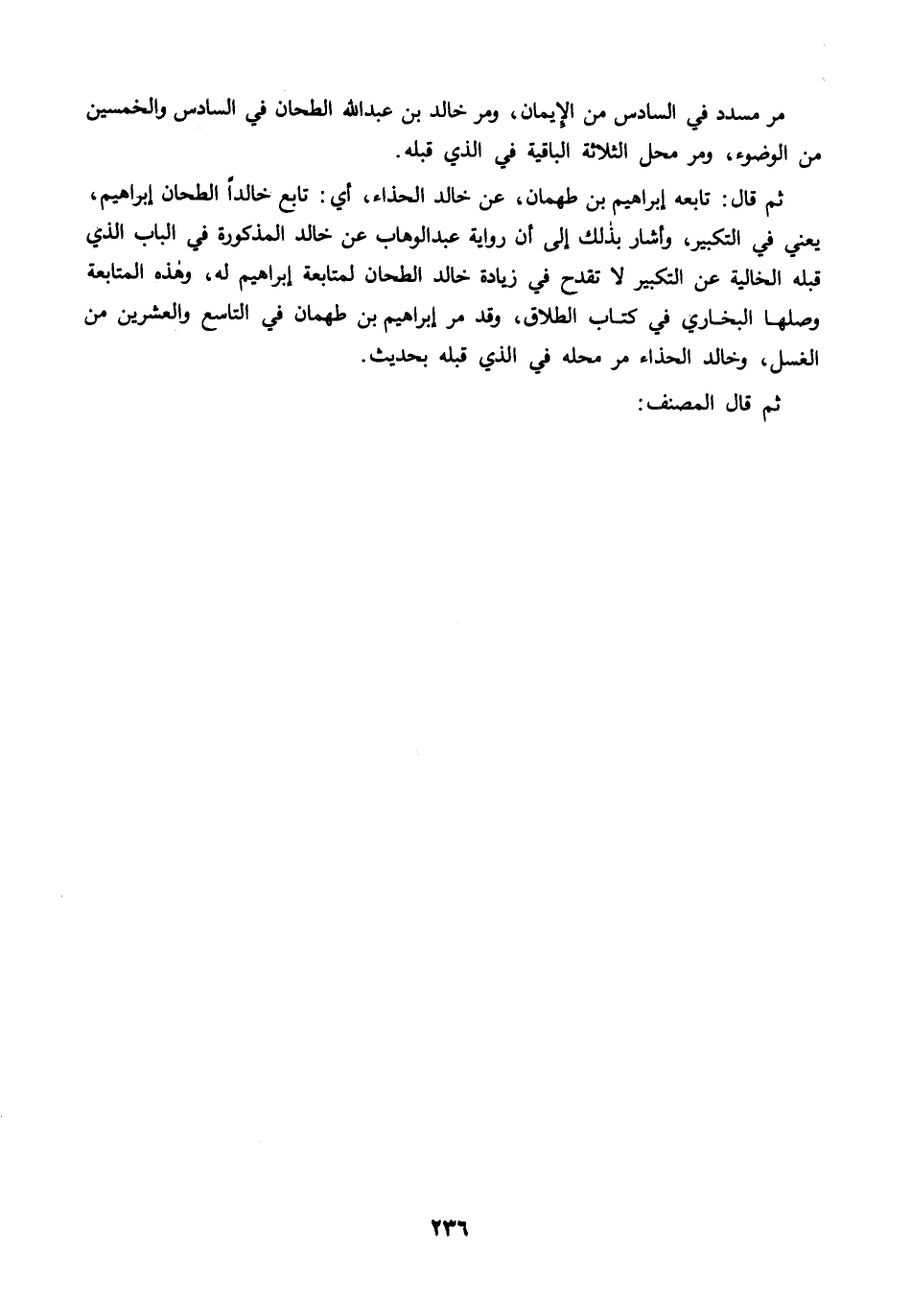 ثم قال: تابعه إبراهيم بن طهمان، عن خالد الحذاء، أي: تابع خالدًا الطحان إبراهيم، يعني في التكبير، وأشار بذلك إلى أن رواية عبدالوهاب عن خالد المذكورة في الباب الذي قبله الخالية عن التكبير لا تقدح في زيادة خالد الطحان لمتابعة إبراهيم له، وهذه المتابعة وصلها البخاري في كتاب الطلاق، وقد مرَّ إبراهيم بن طهمان في التاسع والعشرين من الغسل، وخالد الحذاء مرَّ محله في الذي قبله بحديث.