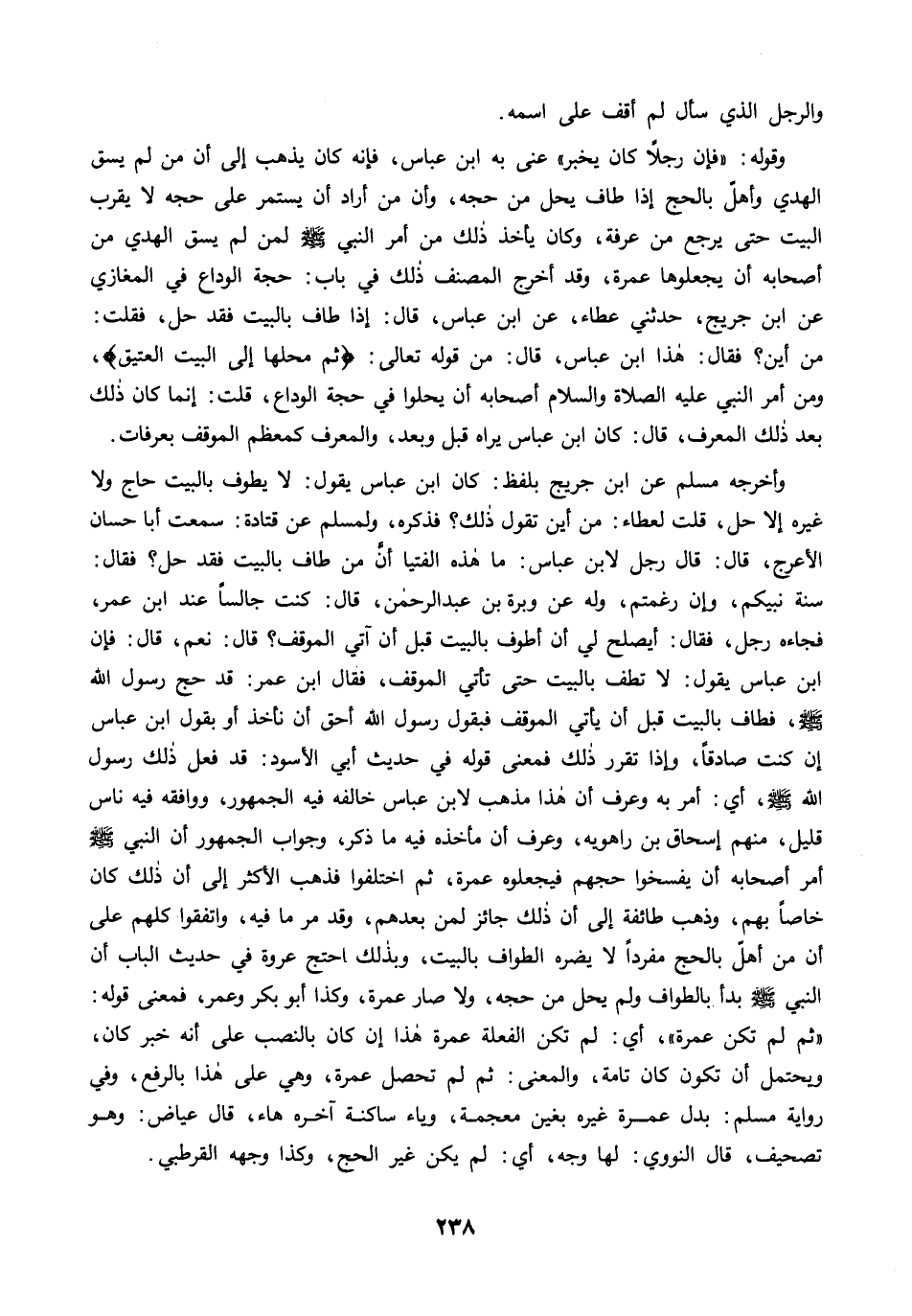 وأخرجه مسلم عن ابن جريج بلفظ: كان ابن عباس يقول: لا يطوف بالبيت حاج ولا غيره إلا حل، قلت لعطاء: من أين تقول ذلك؟ فذكره، ولمسلم عن قتادة: سمعت أبا حسان الأعرج، قال: قال رجل لابن عباس: ما هذه الفتيا أن من طاف بالبيت فقد حل؟ فقال: سنة نبيكم، وإن رغمتم، وله عن وبرة بن عبد الرحمن، قال: كنت جالسًا عند ابن عمر، فجاءه رجل، فقال: أيصلح لي أن أطوف بالبيت قبل أن آتي الموقف؟ قال: نعم، قال: فإن ابن عباس يقول: لا تطف بالبيت حتى تأتي الموقف، فقال ابن عمر: قد حج رسول الله -صلى الله عليه وسلم-، فطاف بالبيت قبل أن يأتي الموقف فبقول رسول الله أحق أن نأخذ أو بقول ابن عباس إن كنت صادقًا، وإذا تقرر ذلك فمعنى قوله في حديث أبي الأسود: قد فعل ذلك رسول الله -صلى الله عليه وسلم-, أي: أمر به وعرف أن هذا مذهب لابن عباس خالفه فيه الجمهور، ووافقه فيه ناس قليل، منهم إسحاق بن راهويه، وعرف أن مأخذه فيه ما ذكر، وجواب الجمهور أن النبي -صلى الله عليه وسلم- أمر أصحابه أن يفسخوا حجهم فيجعلوه عمرة، ثم اختلفوا فذهب الأكثر إلى أن ذلك كان خاصًا بهم، وذهب طائفة إلى أن ذلك جائز لمن بعدهم، وقد مرَّ ما فيه، واتفقوا كلهم على أن من أهل بالحج مفردًا لا يضره الطواف بالبيت، وبذلك إحتج عروة في حديث الباب أن النبي -صلى الله عليه وسلم- بدأ بالطواف ولم يحل من حجه، ولا صار عمرة، وكذا أبو بكر وعمر، فمعنى قوله: "ثم لم تكن عمرة"، أي: لم تكن الفعلة عمرة هذا إن كان بالنصب على أنه خبر كان، ويحتمل أن تكون كان تامة، والمعنى: ثم لم تحصل عمرة، وهي على هذا بالرفع، وفي رواية مسلم: بدل عمرة غيره بغين معجمة، وياء ساكنة آخره هاء، قال عياض: وهو تصحيف، قال النووي: لها وجه، أي: لم يكن غير الحج، وكذا وجهه القرطبي.
