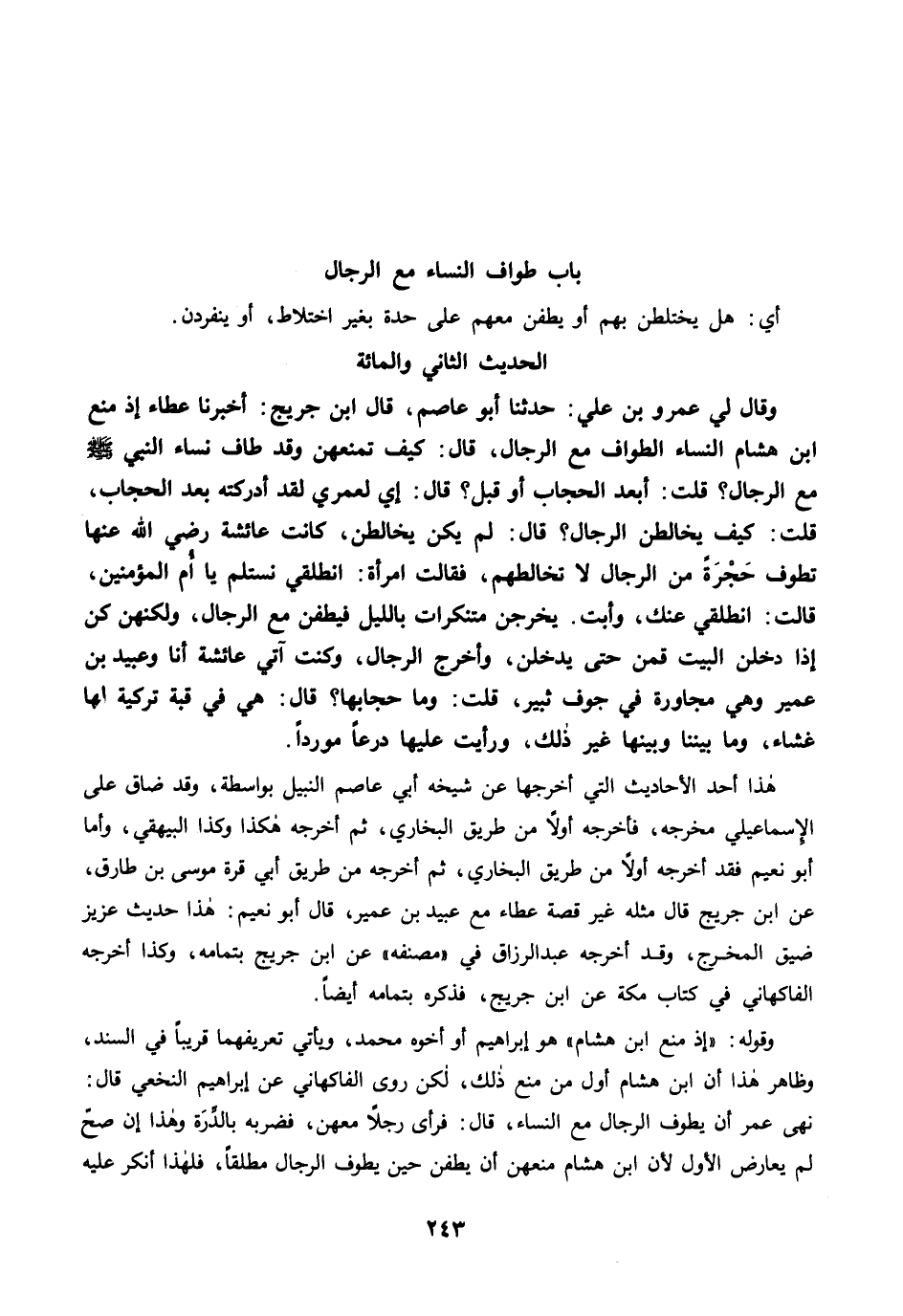 وَقَالَ لِي عَمْرُو بْنُ عَلِيٍّ: حَدَّثَنَا أَبُو عَاصِمٍ، قَالَ ابْنُ جُرَيْجٍ: أَخْبَرَنَا عَطَاءٌ إِذْ مَنَعَ ابْنُ هِشَامٍ النِّسَاءَ الطَّوَافَ مَعَ الرِّجَالِ، قَالَ: كَيْفَ يَمْنَعُهُنَّ، وَقَدْ طَافَ نِسَاءُ النَّبِيِّ -صلى الله عليه وسلم- مَعَ الرِّجَالِ؟ قُلْتُ: أَبَعْدَ الْحِجَابِ أَوْ قَبْلُ؟ قَالَ: إِي لَعَمْرِي لَقَدْ أَدْرَكْتُهُ بَعْدَ الْحِجَابِ. قُلْتُ: كَيْفَ يُخَالِطْنَ الرِّجَالَ؟ قَالَ: لَمْ يَكُنَّ يُخَالِطْنَ، كَانَتْ عَائِشَةُ رضي الله عنها تَطُوفُ حَجْرَةً مِنَ الرِّجَالِ لاَ تُخَالِطُهُمْ، فَقَالَتِ امْرَأَةٌ: انْطَلِقِي نَسْتَلِمْ يَا أُمَّ الْمُؤْمِنِينَ. قَالَتْ: انْطَلِقِي عَنْكِ. وَأَبَتْ. يَخْرُجْنَ مُتَنَكِّرَاتٍ بِاللَّيْلِ فَيَطُفْنَ مَعَ الرِّجَالِ، وَلَكِنَّهُنَّ كُنَّ إِذَا دَخَلْنَ الْبَيْتَ قُمْنَ حَتَّى يَدْخُلْنَ وَأُخْرِجَ الرِّجَالُ، وَكُنْتُ آتِي عَائِشَةَ أَنَا وَعُبَيْدُ بْنُ عُمَيْرٍ وَهِىَ مُجَاوِرَةٌ فِي جَوْفِ ثَبِيرٍ. قُلْتُ: وَمَا حِجَابُهَا؟ قَالَ هِيَ فِي قُبَّةٍ تُرْكِيَّةٍ لَهَا غِشَاءٌ، وَمَا بَيْنَنَا وَبَيْنَهَا غَيْرُ ذَلِكَ، وَرَأَيْتُ عَلَيْهَا دِرْعًا مُوَرَّدًا.