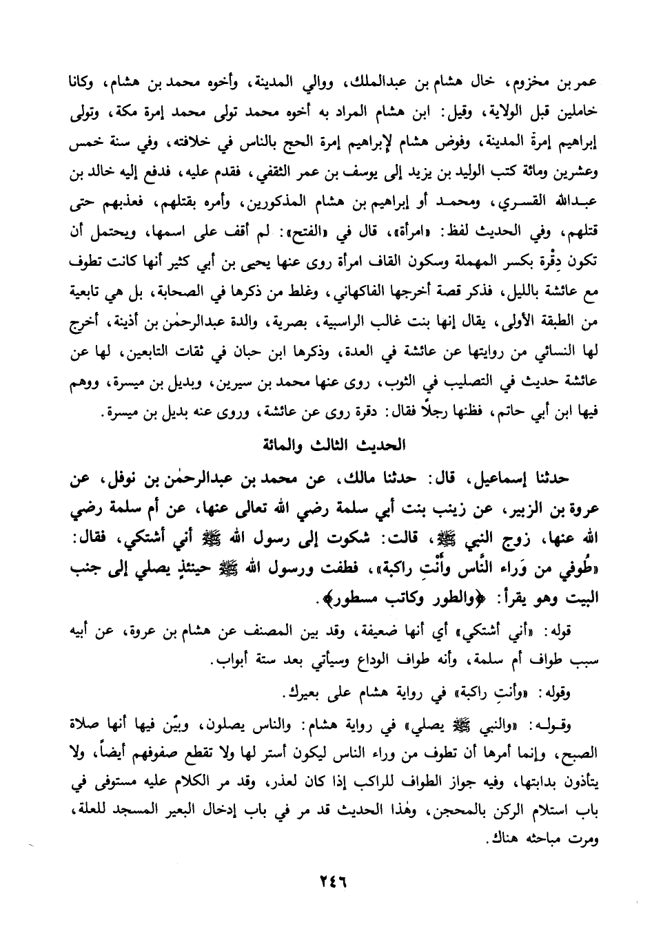 حَدَّثَنَا إِسْمَاعِيلُ، قال: حَدَّثَنَا مَالِكٌ، عَنْ مُحَمَّدِ بْنِ عَبْدِ الرَّحْمَنِ بْنِ نَوْفَلٍ، عَنْ عُرْوَةَ بْنِ الزُّبَيْرِ، عَنْ زَيْنَبَ بِنْتِ أَبِي سَلَمَةَ رضي الله عنها عَنْ أُمِّ سَلَمَةَ رضي الله عنها، زَوْجِ النَّبِيِّ -صلى الله عليه وسلم- قَالَتْ: شَكَوْتُ إِلَى رَسُولِ اللَّهِ -صلى الله عليه وسلم- أَنِّي أَشْتَكِي. فَقَالَ: "طُوفِي مِنْ وَرَاءِ النَّاسِ وَأَنْتِ رَاكِبَةٌ". فَطُفْتُ وَرَسُولُ اللَّهِ -صلى الله عليه وسلم- حِينَئِذٍ يُصَلِّي إِلَى جَنْبِ الْبَيْتِ، وَهْوَ يَقْرَأُ {وَالطُّورِ (1) وَكِتَابٍ مَسْطُورٍ}.