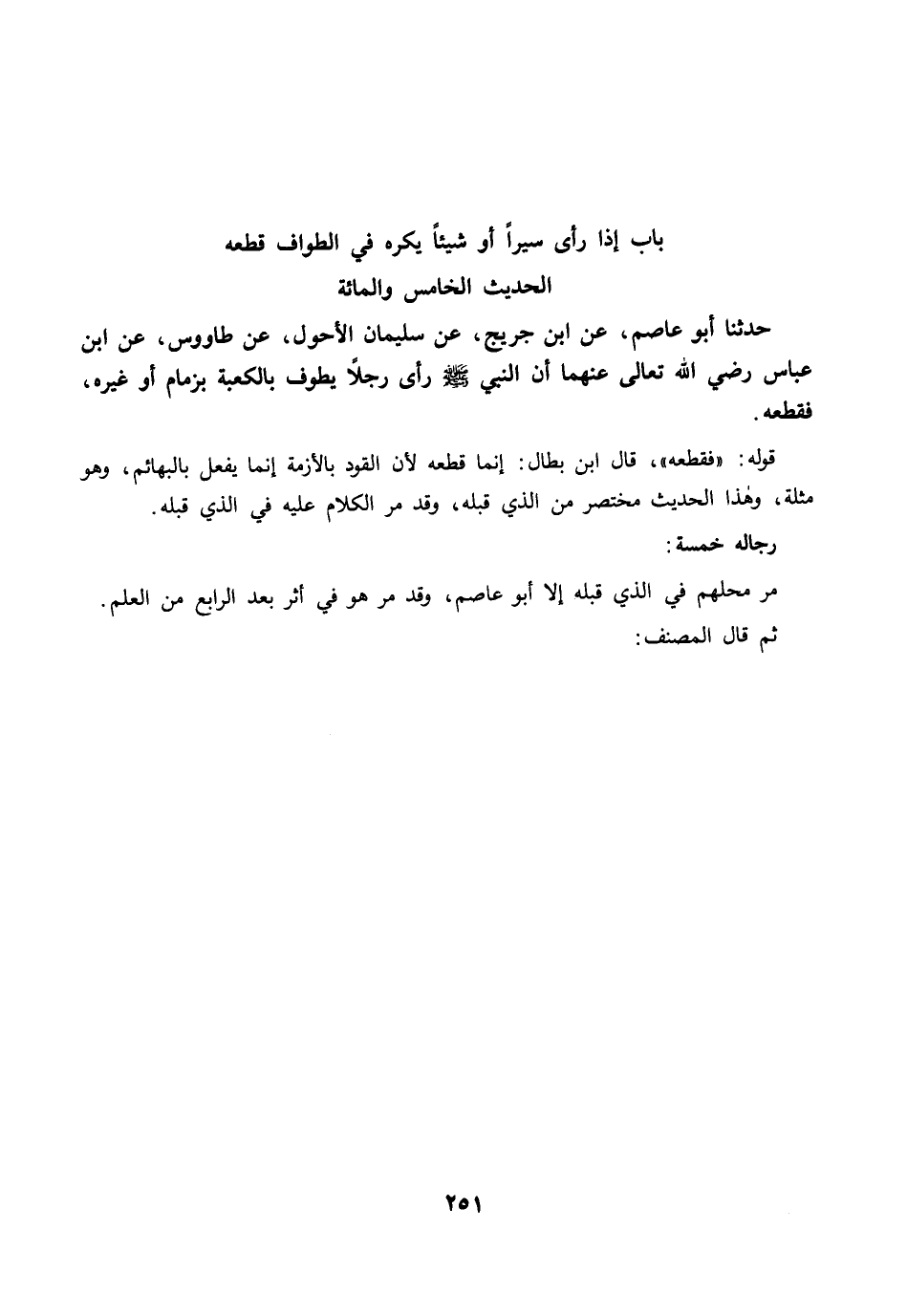 حَدَّثَنَا أَبُو عَاصِمٍ، عَنِ ابْنِ جُرَيْجٍ، عَنْ سُلَيْمَانَ الأَحْوَلِ، عَنْ طَاوُسٍ، عَنِ ابْنِ عَبَّاسٍ رضي الله عنهما أَنَّ النَّبِيَّ -صلى الله عليه وسلم- رَأَى رَجُلاً يَطُوفُ بِالْكَعْبَةِ بِزِمَامٍ أَوْ غَيْرِهِ، فَقَطَعَهُ.
