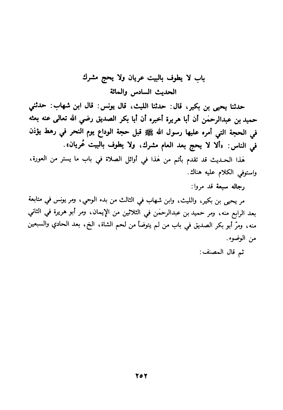حَدَّثَنَا يَحْيَى بْنُ بُكَيْرٍ، قال: حَدَّثَنَا اللَّيْثُ، قَالَ يُونُسُ: قَالَ ابْنُ شِهَابٍ: حَدَّثَنِي حُمَيْدُ بْنُ عَبْدِ الرَّحْمَنِ أَنَّ أَبَا هُرَيْرَةَ أَخْبَرَهُ أَنَّ أَبَا بَكْرٍ الصِّدِّيقَ رضي الله عنه بَعَثَهُ فِي الْحَجَّةِ الَّتِى أَمَّرَهُ عَلَيْهِ رَسُولُ اللَّهِ -صلى الله عليه وسلم- قَبْلَ حَجَّةِ الْوَدَاعِ يَوْمَ النَّحْرِ فِي رَهْطٍ يُؤَذِّنُ فِي النَّاسِ: "أَلاَ لاَ يَحُجُّ بَعْدَ الْعَامِ مُشْرِكٌ، وَلاَ يَطُوفُ بِالْبَيْتِ عُرْيَانٌ".