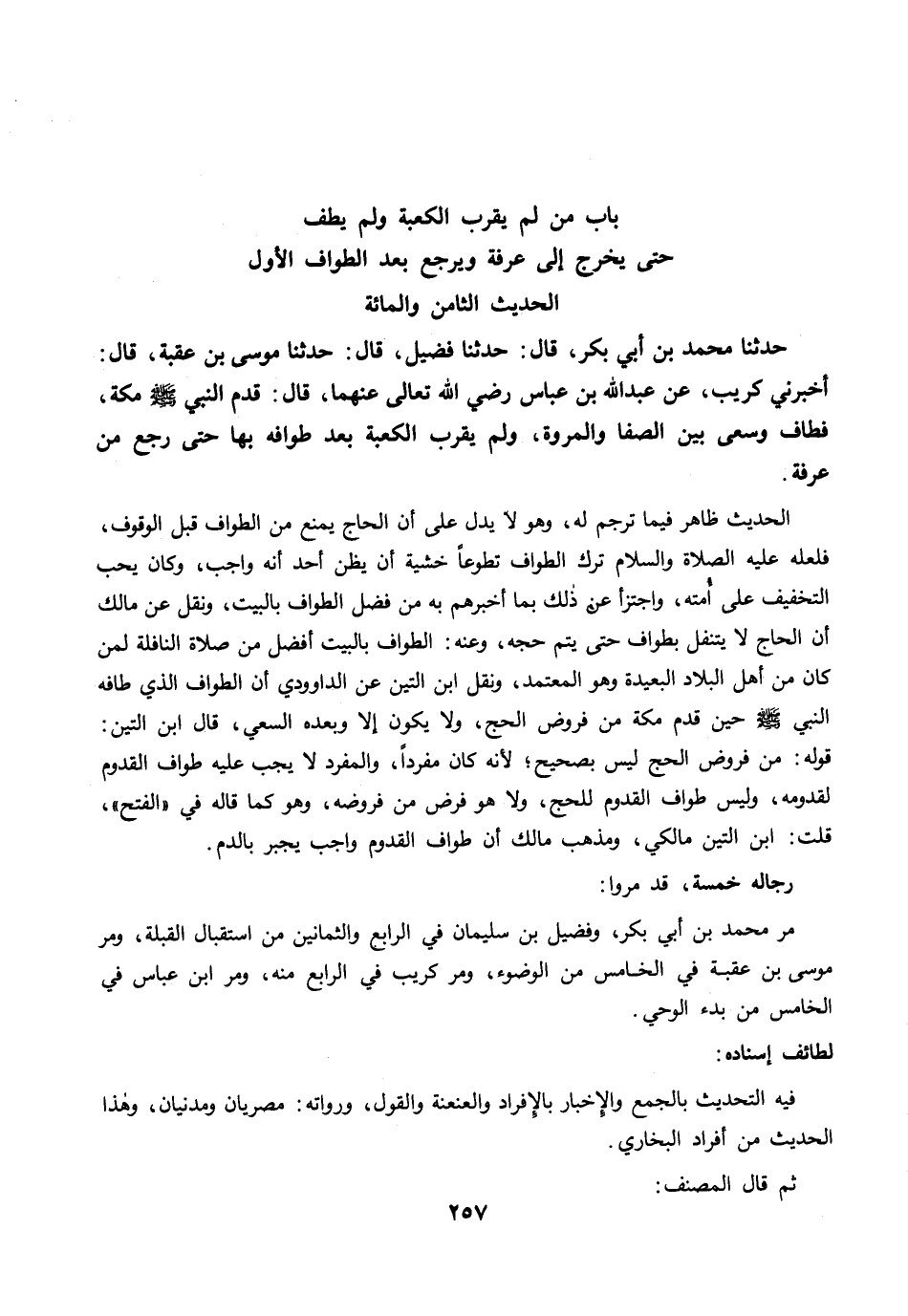 حَدَّثَنَا مُحَمَّدُ بْنُ أَبِي بَكْرٍ، قال: حَدَّثَنَا فُضَيْلٌ، قال: حَدَّثَنَا مُوسَى بْنُ عُقْبَةَ، قال: أَخْبَرَنِي كُرَيْبٌ، عَنْ عَبْدِ اللَّهِ بْنِ عَبَّاسٍ رضي الله عنهما قَالَ: قَدِمَ النَّبِيُّ -صلى الله عليه وسلم- مَكَّةَ، فَطَافَ وَسَعَى بَيْنَ الصَّفَا وَالْمَرْوَةِ، وَلَمْ يَقْرَبِ الْكَعْبَةَ بَعْدَ طَوَافِهِ بِهَا حَتَّى رَجَعَ مِنْ عَرَفَةَ.
