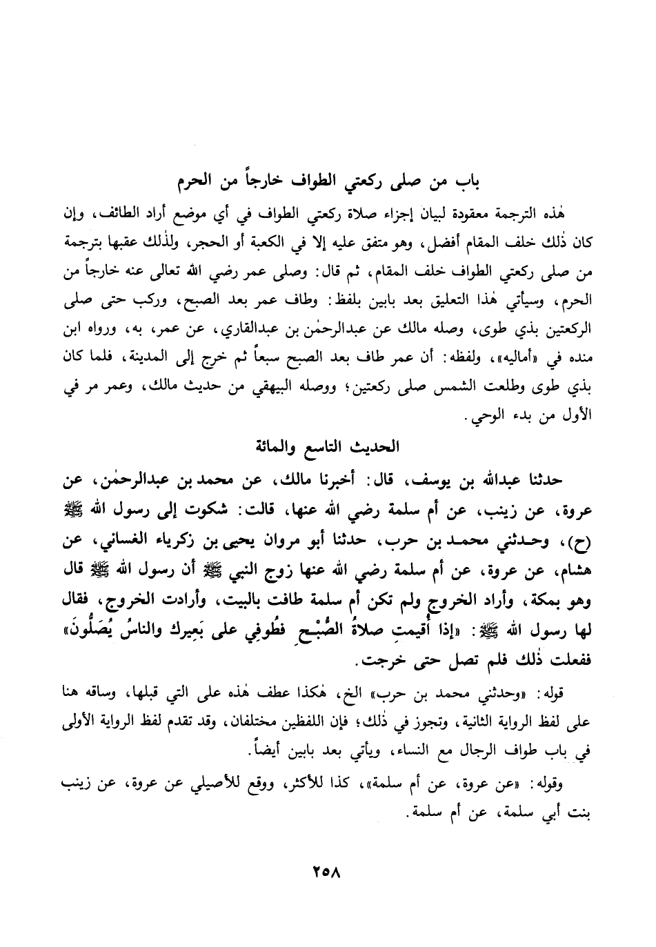 حَدَّثَنَا عَبْدُ اللَّهِ بْنُ يُوسُفَ، قال: أَخْبَرَنَا مَالِكٌ، عَنْ مُحَمَّدِ بْنِ عَبْدِ الرَّحْمَنِ، عَنْ عُرْوَةَ، عَنْ زَيْنَبَ، عَنْ أُمِّ سَلَمَةَ رضي الله عنها، قالت: شَكَوْتُ إِلَى رَسُولِ اللَّهِ -صلى الله عليه وسلم-. وَحَدَّثَنِى مُحَمَّدُ بْنُ حَرْبٍ، حَدَّثَنَا أَبُو مَرْوَانَ يَحْيَى بْنُ أَبِي زَكَرِيَّاءَ الْغَسَّانِيُّ، عَنْ هِشَامٍ، عَنْ عُرْوَةَ، عَنْ أُمِّ سَلَمَةَ رضي الله عنها زَوْجِ النَّبِيِّ -صلى الله عليه وسلم- أَنَّ رَسُولَ اللَّهِ -صلى الله عليه وسلم- قَالَ وَهْوَ بِمَكَّةَ، وَأَرَادَ الْخُرُوجَ، وَلَمْ تَكُنْ أُمُّ سَلَمَةَ طَافَتْ بِالْبَيْتِ، وَأَرَادَتِ الْخُرُوجَ، فَقَالَ لَهَا رَسُولُ اللَّهِ -صلى الله عليه وسلم-: "إِذَا أُقِيمَتْ صَلاَةُ الصُّبْحِ فَطُوفِي عَلَى بَعِيرِكِ، وَالنَّاسُ يُصَلُّونَ". فَفَعَلَتْ ذَلِكَ، فَلَمْ تُصَلِّ حَتَّى خَرَجَتْ.