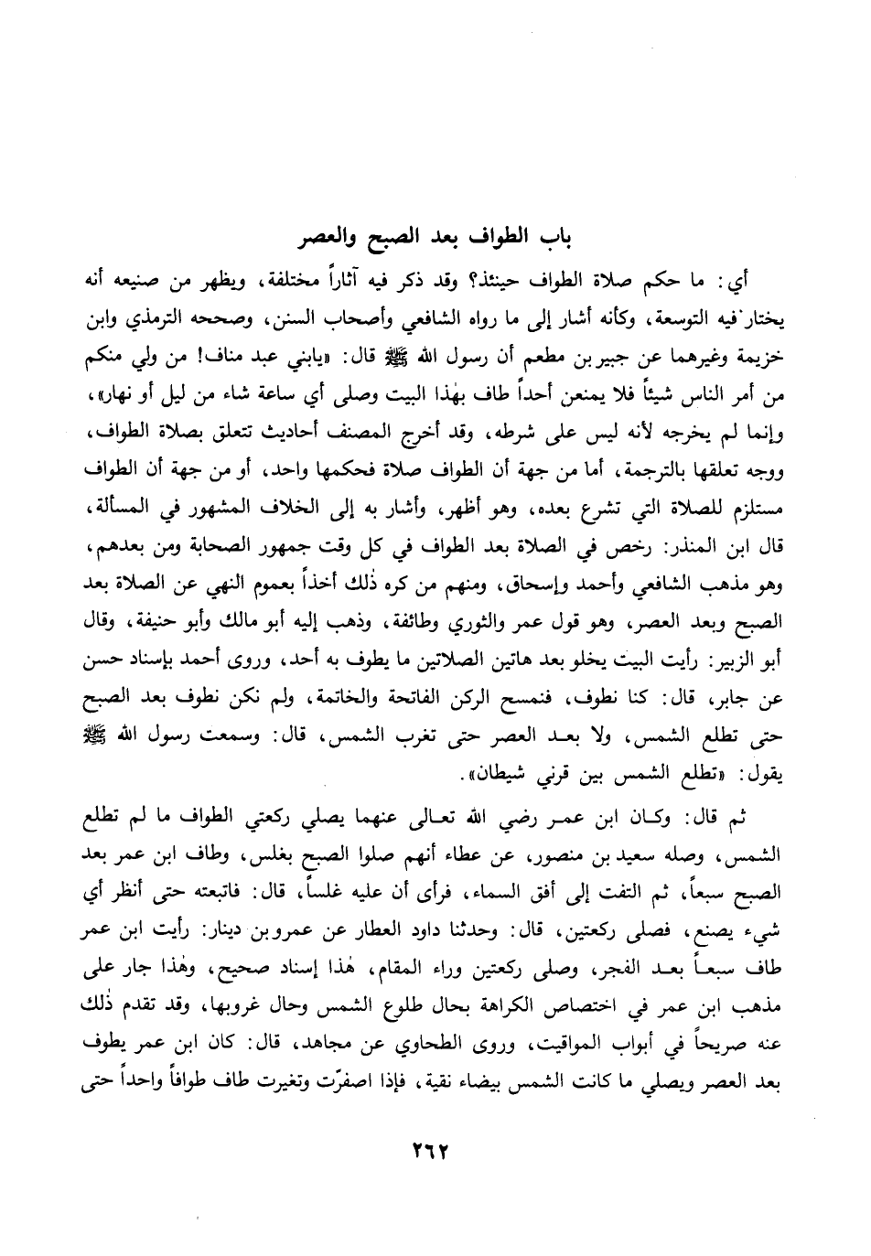 ثم قال: وكان ابن عمر رضي الله تعالى عنهما يصلي ركعتي الطواف ما لم تطلع الشمس، وصله سعيد بن منصور، عن عطاء أنهم صلوا الصبح بغلس، وطاف ابن عمر بعد الصبح سبعًا، ثم التفت إلى أفق السماء، فرأى أن عليه غلسًا، قال: فاتبعته حتى انظر أي شيء يصنع، فصلى ركعتين، قال: وحدثنا داود العطار عن عمرو بن دينار: رأيت ابن عمر طاف سبعًا بعد الفجر، وصلى ركعتين وراء المقام، هذا إسناد صحيح، وهذا جار على مذهب ابن عمر في اختصاص الكراهة بحال طلوع الشمس وحال غروبها، وقد تقدم ذلك عنه صريحًا في أبواب المواقيت، وروى الطحاوي عن مجاهد، قال: كان ابن عمر يطوف بعد العصر ويصلي ما كانت الشمس بيضاء نقية، فإذا اصفرّت وتغيرت طاف طوافًا واحدًا حتى