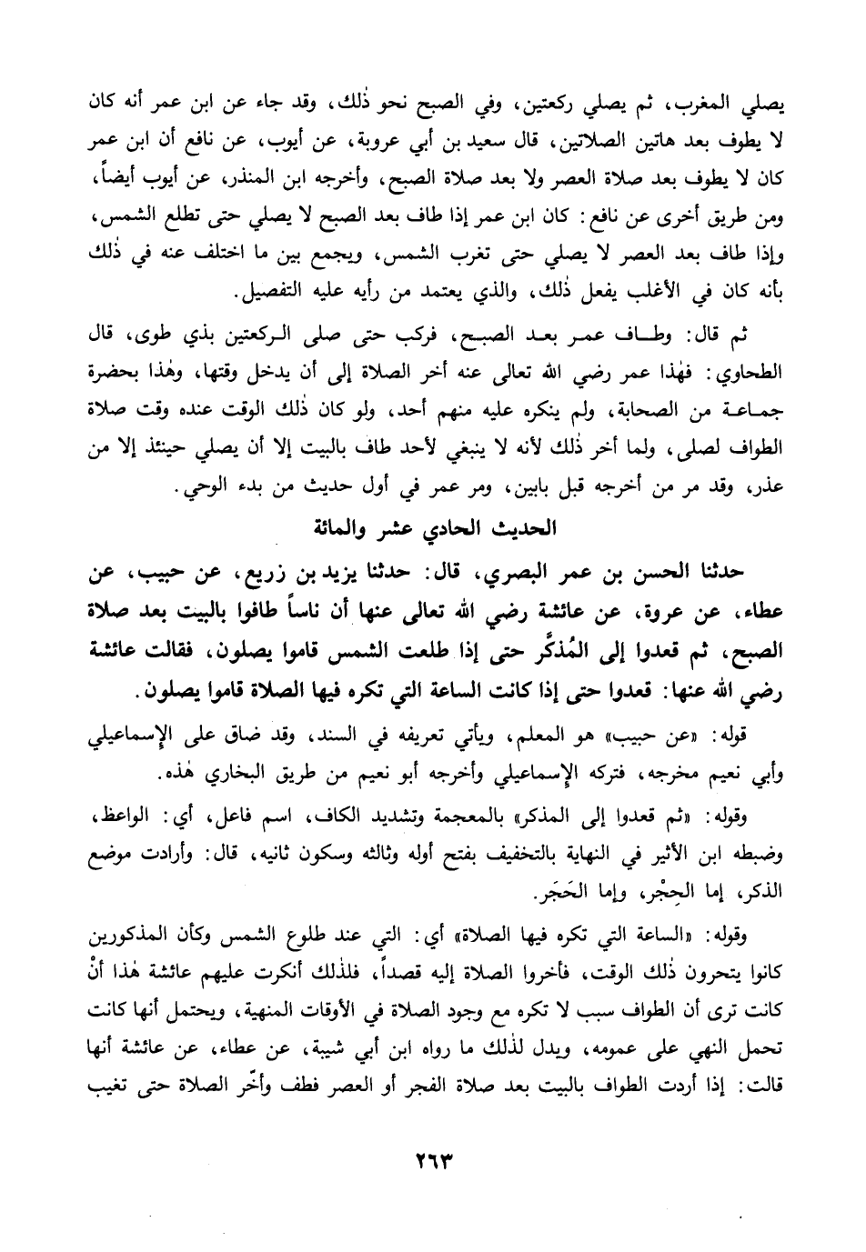 حَدَّثَنَا الْحَسَنُ بْنُ عُمَرَ الْبَصْرِيُّ، قال: حَدَّثَنَا يَزِيدُ بْنُ زُرَيْعٍ، عَنْ حَبِيبٍ، عَنْ عَطَاءٍ، عَنْ عُرْوَةَ، عَنْ عَائِشَةَ رضي الله عنها أَنَّ نَاسًا طَافُوا بِالْبَيْتِ بَعْدَ صَلاَةِ الصُّبْحِ، ثُمَّ قَعَدُوا إِلَى الْمُذَكِّرِ، حَتَّى إِذَا طَلَعَتِ الشَّمْسُ قَامُوا يُصَلُّونَ، فَقَالَتْ عَائِشَةُ رضي الله عنها: قَعَدُوا حَتَّى إِذَا كَانَتِ السَّاعَةُ الَّتِى تُكْرَهُ فِيهَا الصَّلاَةُ قَامُوا يُصَلُّونَ.