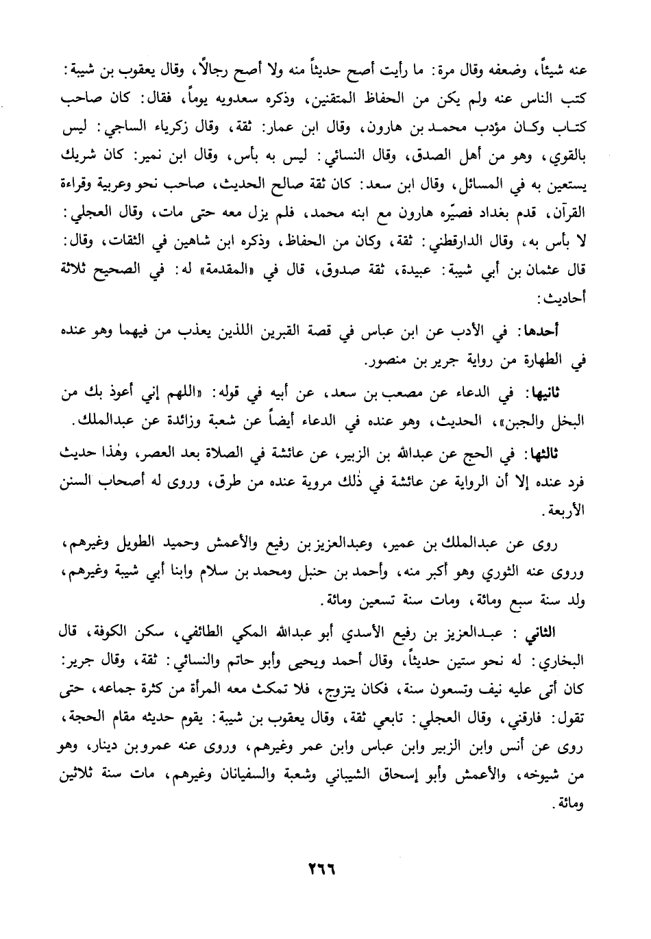 عنه شيئًا، وضعفه وقال مرة: ما رأيت أصح حديثًا منه ولا أصح رجالًا، وقال يعقوب بن شيبة: كتب الناس عنه ولم يكن من الحفاظ المتقنين، وذكره سعدويه يومًا، فقال: كان صاحب كتاب وكان مؤدب محمد بن هارون، وقال ابن عمار: ثقة، وقال زكرياء الساجي: ليس بالقوي، وهو من أهل الصدق، وقال النسائي: ليس به بأس، وقال ابن نمير: كان شريك يستعين به في المسائل، وقال ابن سعد: كان ثقة صالح الحديث، صاحب نحو وعربية وقراءة القرآن، قدم بغداد فصيّره هارون مع ابنه محمد، فلم يزل معه حتى مات، وقال العجلي: لا بأس به, وقال الدارقطني: ثقة، وكان من الحفاظ، وذكره ابن شاهين في الثقات، وقال: قال عثمان بن أبي شيبة: عبيدة، ثقة صدوق، قال في "المقدمة" له: في الصحيح ثلاثة أحاديث: