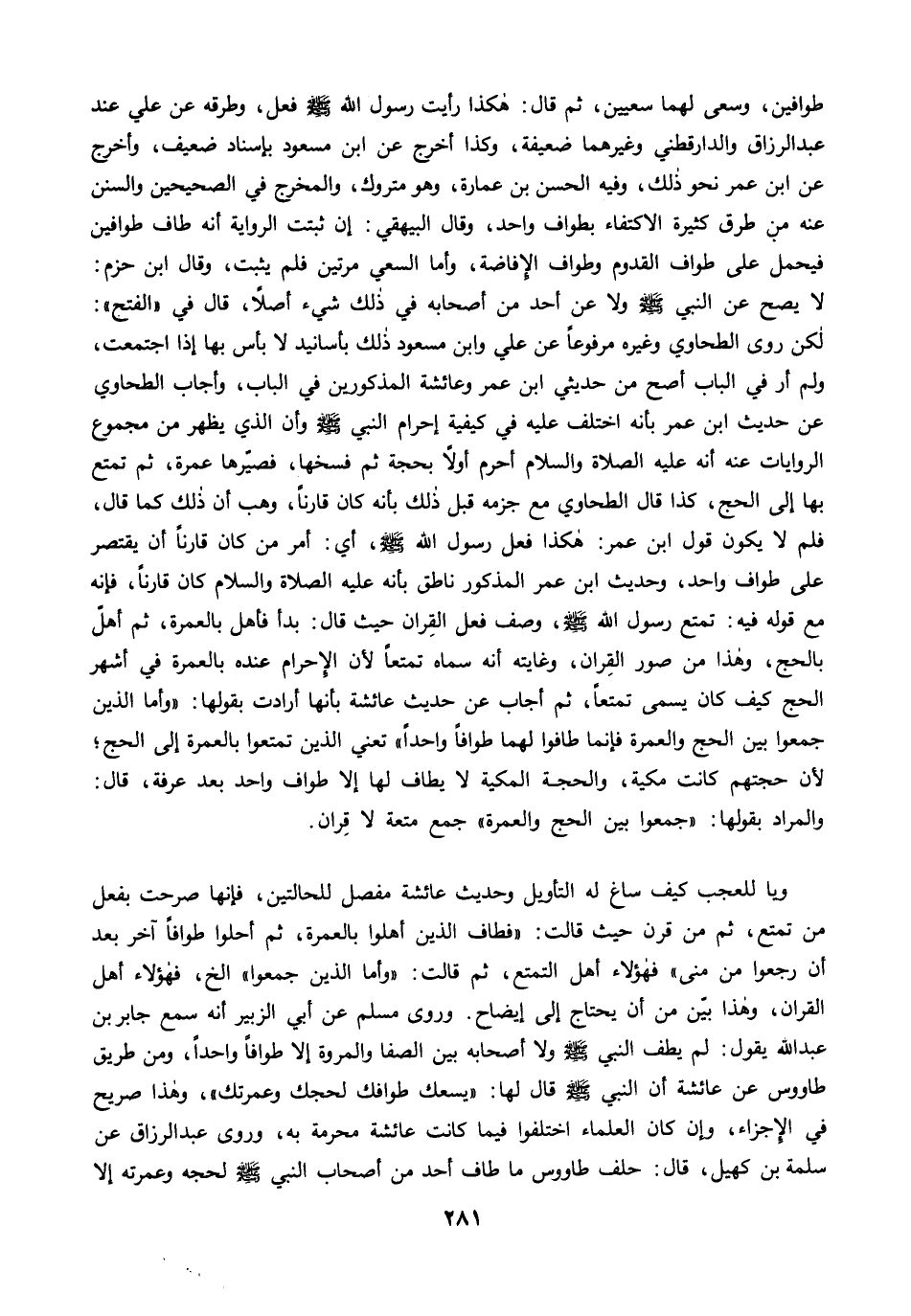 ويا للعجب كيف ساغ له التأويل وحديث عائشة مفصل للحالتين، فإنها صرحت بفعل من تمتع، ثم من قرن حيث قالت: "فطاف الذين أهلوا بالعمرة، ثم أحلوا طوافًا آخر بعد أن رجعوا من منى" فهؤلاء أهل التمتع، ثم قالت: "وأما الذين جمعوا" الخ، فهؤلاء أهل القران، وهذا بيّن من أن يحتاج إلى إيضاح. وروى مسلم عن أبي الزبير أنه سمع جابر بن عبد الله يقول: لم يطف النبي -صلى الله عليه وسلم- ولا أصحابه بين الصفا والمروة إلا طوافًا واحدًا، ومن طريق طاووس عن عائشة أن النبي -صلى الله عليه وسلم- قال لها: "يسعك طوافك لحجك وعمرتك"، وهذا صريح في الإجزاء، وإن كان العلماء اختلفوا فيما كانت عائشة محرمة به، وروى عبد الرزاق عن سلمة بن كهيل، قال: حلف طاووس ما طاف أحد من أصحاب النبي -صلى الله عليه وسلم- لحجه وعمرته إلا