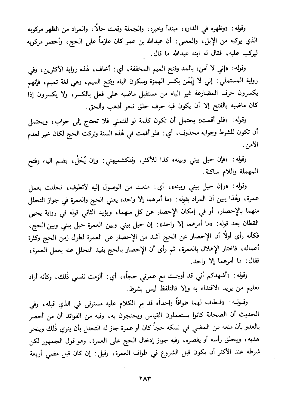 وقوله: "وإن حيل بيني وبينه"، أي: منعت من الوصول إليه لأتطوف، تحللت بعمل عمرة، وهذا يبين أن المراد بقوله: "ما أمرهما إلا واحد" يعني الحج والعمرة في جواز التحلل منهما بالإحصار، أو في إمكان الإحصار عن كل منهما، ويؤيد الثاني قوله في رواية يحيى القطان بعد قوله: "ما أمرهما إلا واحد": إن حيل بيني وبين العمرة حيل بيني وبين الحج، فكأنه رأى أولًا أن الإحصار عن الحج أشد من الإحصار عن العمرة لطول زمن الحج وكثرة أعماله، فاختار الإهلال بالعمرة، ثم رأى أن الإحصار بالحج يفيد التحلل عنه بعمل العمرة، فقال: ما أمرهما إلا واحد.