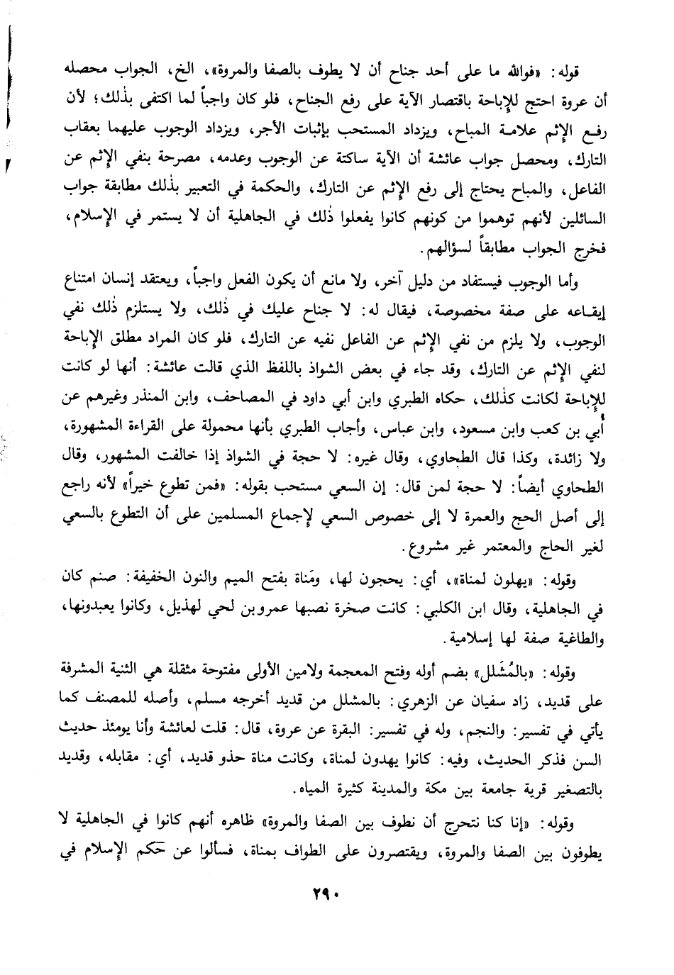 وأما الوجوب فيستفاد من دليل آخر، ولا مانع أن يكون الفعل واجبًا، ويعتقد إنسان امتناع إيقاعه على صفة مخصوصة، فيقال له: لا جناح عليك في ذلك، ولا يستلزم ذلك نفي الوجوب، ولا يلزم من نفي الإثم عن الفاعل نفيه عن التارك، فلو كان المراد مطلق الإباحة لنفي الإثم عن التارك، وقد جاء في بعض الشواذ باللفظ الذي قالت عائشة: أنها لو كانت للإباحة لكانت كذلك، حكاه الطبري وابن أبي داود في المصاحف، وابن المنذر وغيرهم عن أُبي بن كعب وابن مسعود، وابن عباس، وأجاب الطبري بأنها محمولة على القراءة المشهورة، ولا زائدة، وكذا قال الطحاوي، وقال غيره: لا حجة في الشواذ إذا خالفت المشهور، وقال الطحاوي أيضًا: لا حجة لمن قال: إن السعي مستحب بقوله: "فمن تطوع خيرًا" لأنه راجع إلى أصل الحج والعمرة لا إلى خصوص السعي لإجماع المسلمين على أن التطوع بالسعي لغير الحاج والمعتمر غير مشروع.