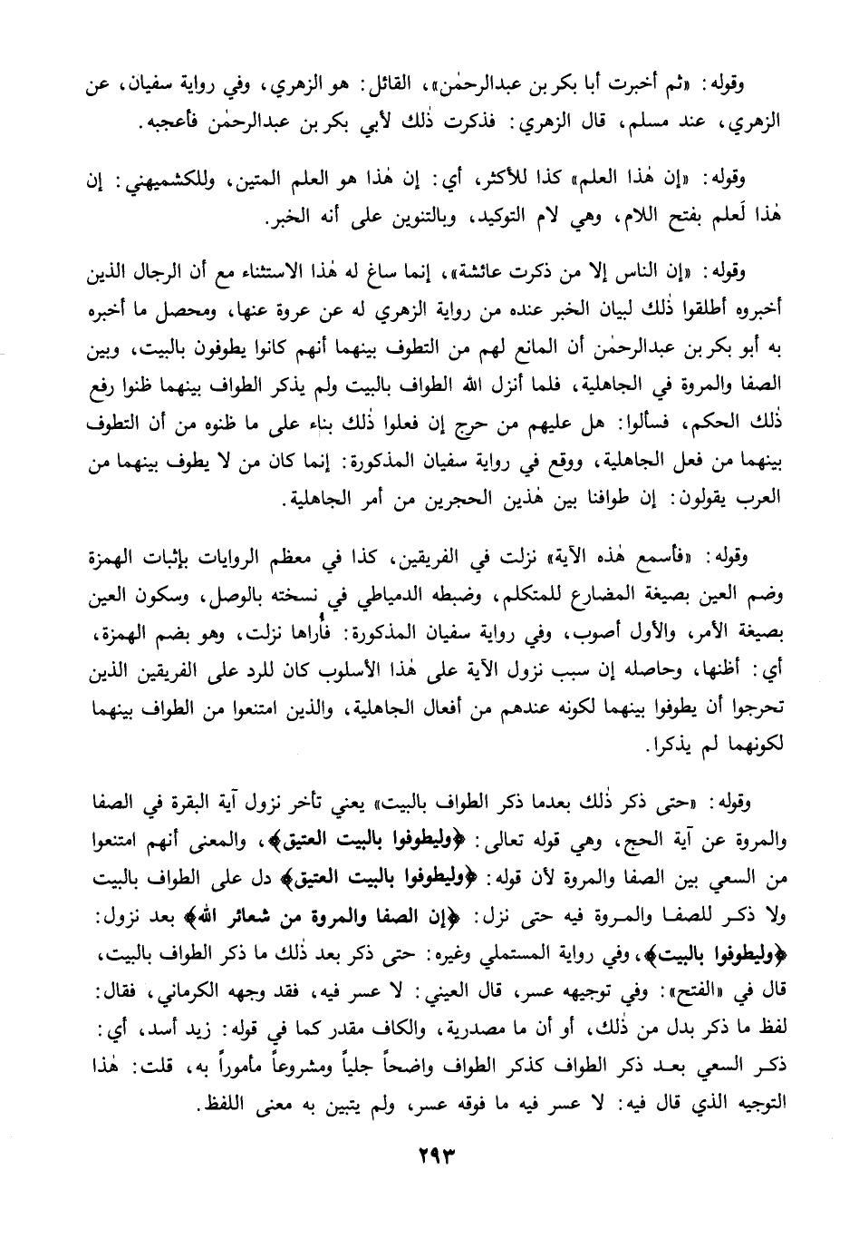 وقوله: "إن الناس إلا من ذكرت عائشة"، إنما ساغ له هذا الاستثناء مع أن الرجال الذين أخبروه أطلقوا ذلك لبيان الخبر عنده من رواية الزهري له عن عروة عنها، ومحصل ما أخبره به أبو بكر بن عبد الرحمن أن المانع لهم من التطوف بينهما أنهم كانوا يطوفون بالبيت، وبين الصفا والمروة في الجاهلية، فلما أنزل الله الطواف بالبيت ولم يذكر الطواف بينهما ظنوا رفع ذلك الحكم، فسألوا: هل عليهم من حرج إن فعلوا ذلك بناء على ما ظنوه من أن التطوف بينهما من فعل الجاهلية، ووقع في رواية سفيان المذكورة: إنما كان من لا يطوف بينهما من العرب يقولون: إن طوافنا بين هذين الحجرين من أمر الجاهلية.