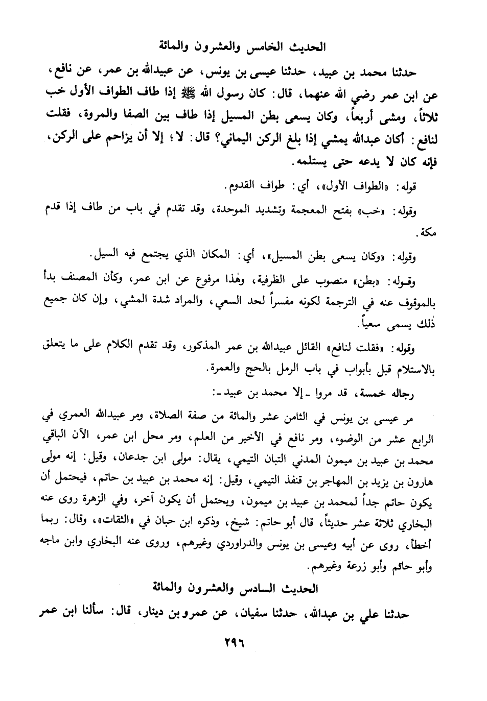 مرَّ عيسى بن يونس في الثامن عشر والمائة من صفة الصلاة، ومرَّ عبيد الله العمري في الرابع عشر من الوضوء، ومرَّ نافع في الأخير من العلم، ومرَّ محل ابن عمر، الآن الباقي محمد بن عبيد بن ميمون المدني التبان التيمي، يقال: مولى ابن جدعان، وقيل: إنه مولى هارون بن يزيد بن المهاجر بن قنفذ التيمي، وقيل: إنه محمد بن عبيد بن حاتم، فيحتمل أن يكون حاتم جدًا لمحمد بن عبيد بن ميمون، ويحتمل أن يكون آخر، وفي الزهرة روى عنه البخاري ثلاثة عشر حديثًا، قال أبو حاتم: شيخ، وذكره ابن حبان في "الثقات"، وقال: ربما أخطأ، روى عن أبيه وعيسى بن يونس والدراوردي وغيرهم، وروى عنه البخاري وابن ماجه وأبو حاتم وأبو زرعة وغيرهم.