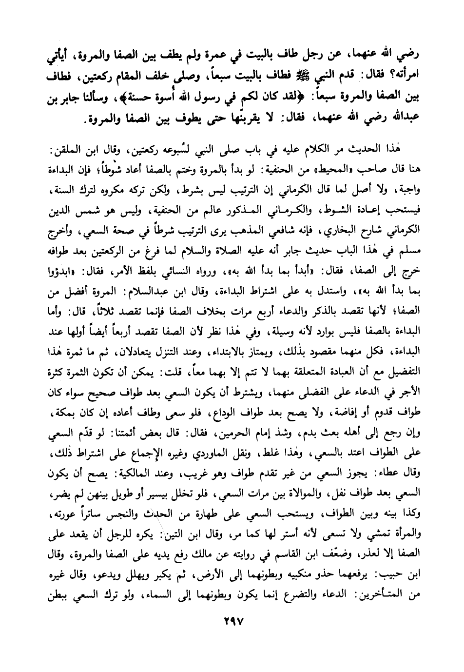 رضي الله عنهما، عَنْ رَجُلٍ طَافَ بِالْبَيْتِ فِي عُمْرَةٍ، وَلَمْ يَطُفْ بَيْنَ الصَّفَا وَالْمَرْوَةِ، أَيَأْتِي امْرَأَتَهُ؟ فَقَالَ: قَدِمَ النَّبِيُّ -صلى الله عليه وسلم- فَطَافَ بِالْبَيْتِ سَبْعًا، وَصَلَّى خَلْفَ الْمَقَامِ رَكْعَتَيْنِ، فَطَافَ بَيْنَ الصَّفَا وَالْمَرْوَةِ سَبْعًا: {لَقَدْ كَانَ لَكُمْ فِي رَسُولِ اللَّهِ أُسْوَةٌ حَسَنَةٌ}.