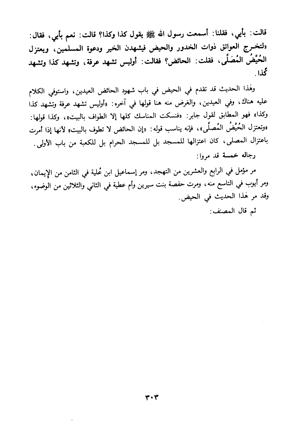 مرَّ مؤمل في الرابع والعشرين من التهجد، ومرَّ إسماعيل ابن عُلية في الثامن من الإيمان، ومرَّ أيوب في التاسع منه، ومرت حفصة بنت سيرين وأم عطية في الثاني والثلاثين من الوضوء، وقد مرَّ هذا الحديث في الحيض.