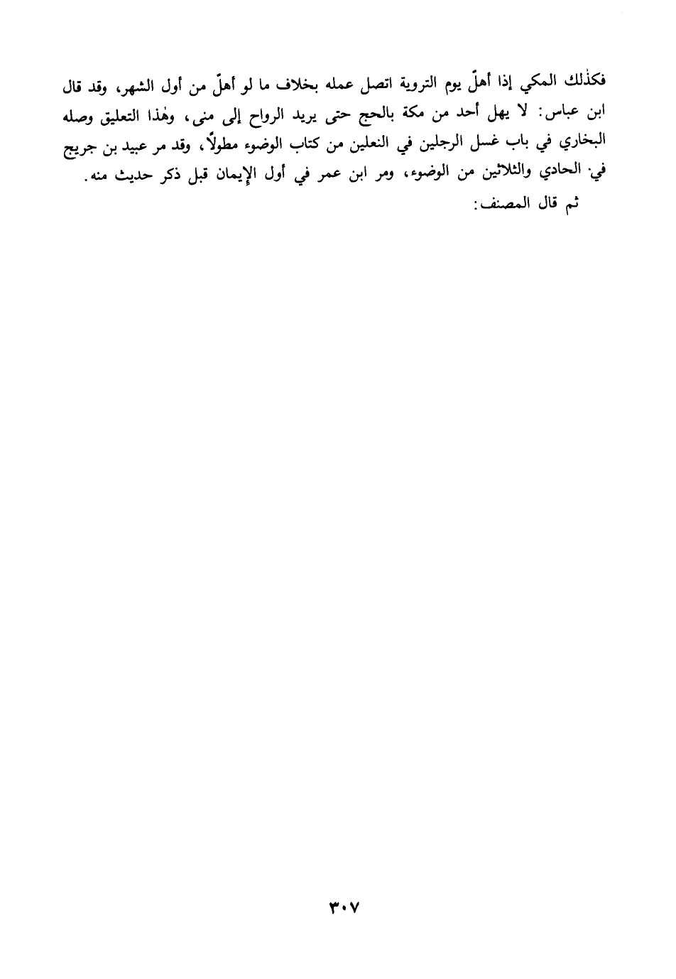فكذلك المكي إذا أهلّ يوم التروية اتصل عمله بخلاف ما لو أهلّ من أول الشهر، وقد قال ابن عباس: لا يهل أحد من مكة بالحج حتى يريد الرواح إلى مني، وهذا التعليق وصله البخاري في باب غسل الرجلين في النعلين من كتاب الوضوء مطولًا، وقد مرَّ عبيد بن جريج في الحادي والثلاثين من الوضوء، ومرَّ ابن عمر في أول الإيمان قبل ذكر حديث منه.