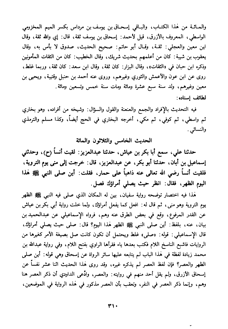 هذا فيه اختصار توضحه رواية سفيان، بين له المكان الذي صلى فيه النبي -صلى الله عليه وسلم- الظهر يوم التروية وهو منى، ثم قال له: افعل كما يفعل أمراؤك، ولما خلت رواية أبي بكر بن عياش عن القدر المرفوع، وقع في بعض الطرق عنه وهم، فرواه الإسماعيلي عن عبد الحميد بن بيان، عنه، بلفظ: أين صلى النبي -صلى الله عليه وسلم- الظهر هذا اليوم؟ قال: صلى حيث يصلي أمراؤك، قال الإسماعيلي: قوله: "صلى" غلط ويحتمل أن تكون كانت صل بصيغة الأمر كغيرها من الروايات فأشبع الناسخ اللام فكتب بعدها ياء فقرأها الراوي بفتح اللام، وفي رواية عبد الله بن محمد زيادة لفظة في هذا الباب لم يتابعه عليها سائر الرواة عن إسحاق وهي قوله: أين صلى الظهر والعصر؟ فإن لفظ العصر لم يذكره غيره، وقد روى هذا الحديث اثنا عشر نفسًا عن إسحاق الأزرق، ولم يقل أحد منهم في روايته: والعصر، وادَّعى الداودي أن ذكر العصر هنا وهم، وإنما ذكر العصر في النفر، وتعقب بأن العصر مذكور في هذه الرواية في الموضعين،