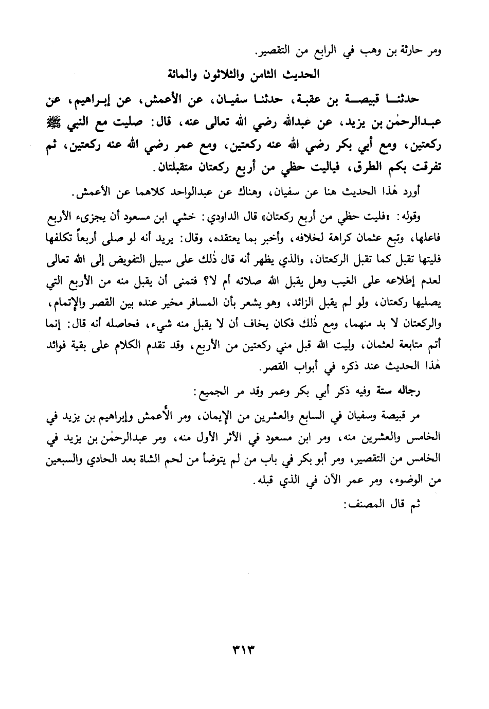 مرَّ قبيصة وسفيان في السابع والعشرين من الإيمان، ومرَّ الأعمش وإبراهيم بن يزيد في الخامس والعشرين منه، ومرَّ ابن مسعود في الأثر الأول منه، ومرَّ عبد الرحمن بن يزيد في الخامس من التقصير، ومرَّ أبو بكر في باب من لم يتوضأ من لحم الشاة بعد الحادي والسبعين من الوضوء ومرَّ عمر الآن في الذي قبله.