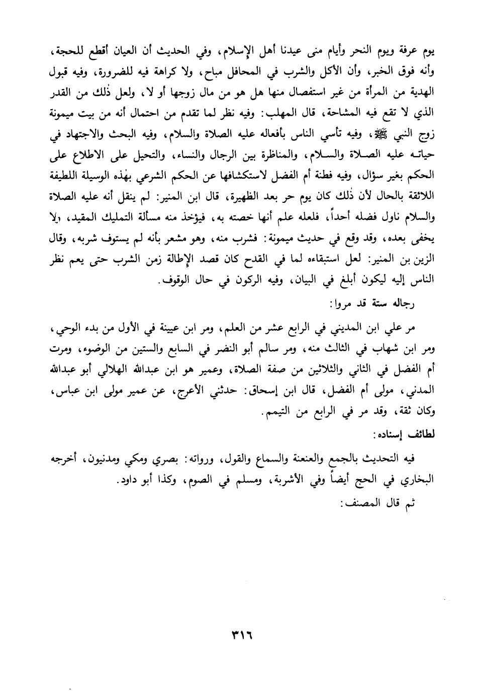 مرَّ علي ابن المديني في الرابع عشر من العلم، ومرَّ ابن عيينة في الأول من بدء الوحي، ومرَّ ابن شهاب في الثالث منه، ومرَّ سالم أبو النضر في السابع والستين من الوضوء، ومرت أم الفضل في الثاني والثلاثين من صفة الصلاة، وعمير هو ابن عبد الله الهلالي أبو عبد الله المدني، مولى أم الفضل، قال ابن إسحاق: حدثني الأعرج، عن عمير مولى ابن عباس، وكان ثقة، وقد مرَّ في الرابع من التيمم.