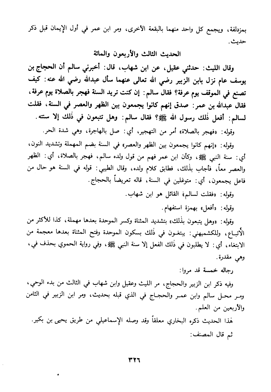 وَقَالَ اللَّيْثُ: حَدَّثَنِي عُقَيْلٌ، عَنِ ابْنِ شِهَابٍ، قَالَ: أَخْبَرَنِي سَالِمٌ أَنَّ الْحَجَّاجَ بْنَ يُوسُفَ عَامَ نَزَلَ بِابْنِ الزُّبَيْرِ رضي الله عنهما سَأَلَ عَبْدَ اللَّهِ رضي الله عنه: كَيْفَ تَصْنَعُ فِي الْمَوْقِفِ يَوْمَ عَرَفَةَ؟ فَقَالَ سَالِمٌ: إِنْ كُنْتَ تُرِيدُ السُّنَّةَ فَهَجِّرْ بِالصَّلاَةِ يَوْمَ عَرَفَةَ. فَقَالَ عَبْدُ اللَّهِ بْنُ عُمَرَ: صَدَقَ. إِنَّهُمْ كَانُوا يَجْمَعُونَ بَيْنَ الظُّهْرِ وَالْعَصْرِ فِي السُّنَّةِ. فَقُلْتُ لِسَالِمٍ: أَفَعَلَ ذَلِكَ رَسُولُ اللَّهِ -صلى الله عليه وسلم-؟ فَقَالَ سَالِمٌ: وَهَلْ تَتَّبِعُونَ فِي ذَلِكَ إِلاَّ سُنَّتَهُ