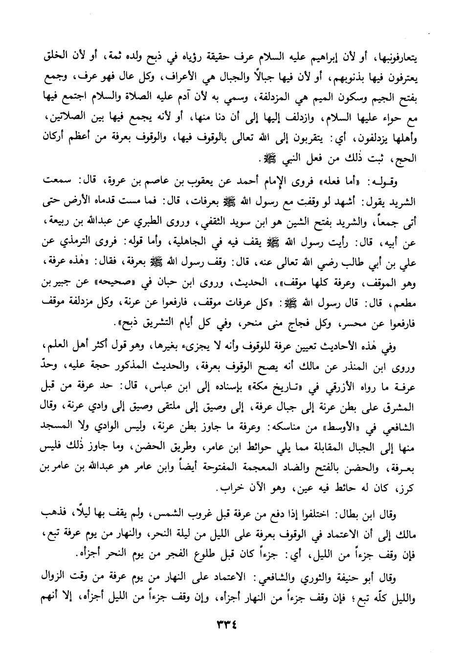 وفي هذه الأحاديث تعيين عرفة للوقوف وأنه لا يجزيء بغيرها، وهو قول أكثر أهل العلم، وروى ابن المنذر عن مالك أنه يصح الوقوف بعرفة، والحديث المذكور حجة عليه، وحدّ عرفة ما رواه الأزرقي في "تاريخ مكة" بإسناده إلى ابن عباس، قال: حد عرفة من قبل المشرق على بطن عرنة إلى جبال عرفة، إلى وصيق إلى ملتقى وصيق إلى وادي عرنة، وقال الشافعي في "الأوسط" من مناسكه: وعرفة ما جاوز بطن عرنة، وليس الوادي ولا المسجد منها إلى الجبال المقابلة مما يلي حوائط ابن عامر، وطريق الحضن، وما جاوز ذلك فليس بعرفة، والحضن بالفتح والضاد المعجمة المفتوحة أيضًا وابن عامر هو عبد الله بن عامر بن كرز، كان له حائط فيه عين، وهو الآن خراب.